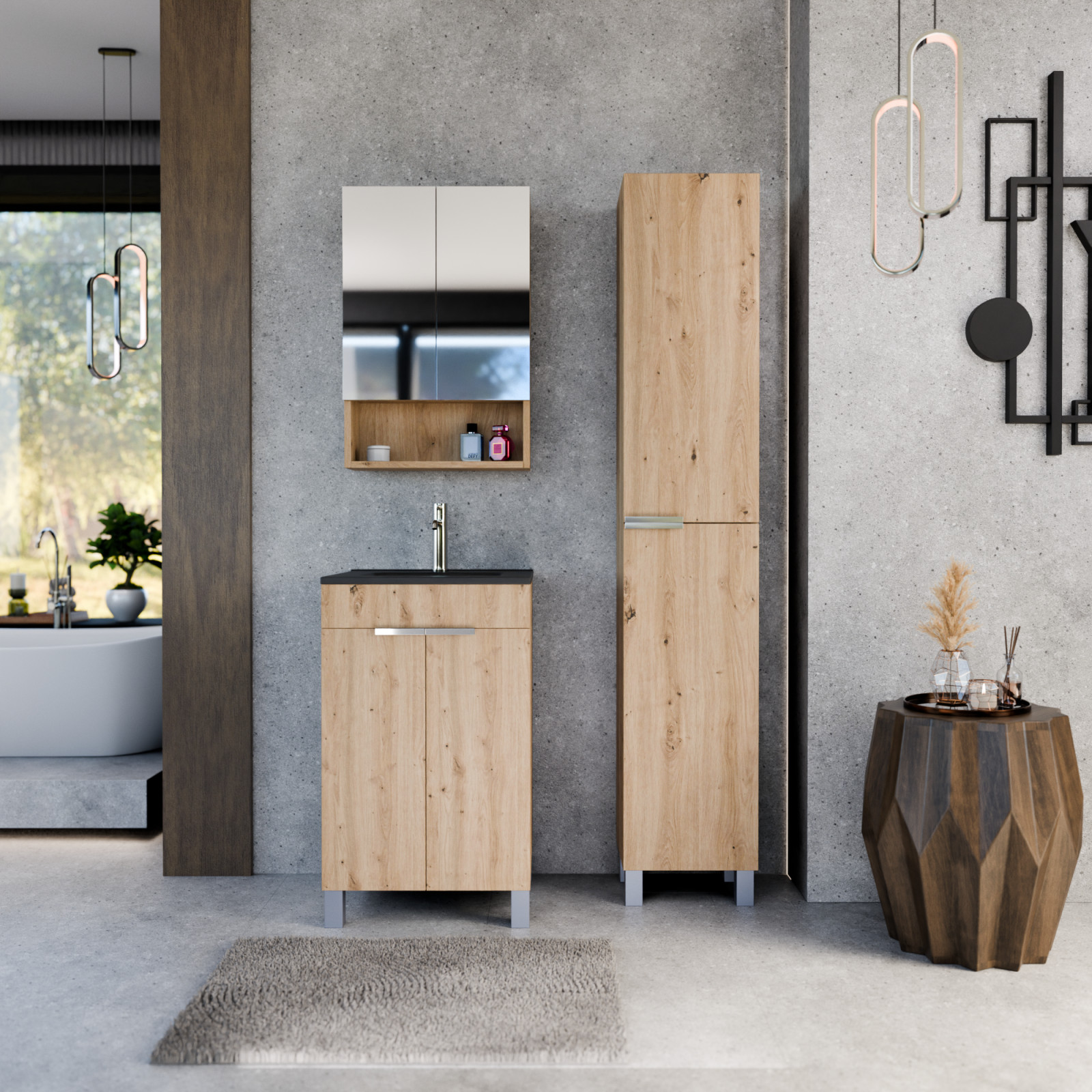 HD Paris Oak 50 komplett fürdőszoba bútor szett álló mosdószekrénnyel, fényes króm elemekkel, matt fekete slim mosdóval, tükrös szekrénnyel és magasszekrénnyel