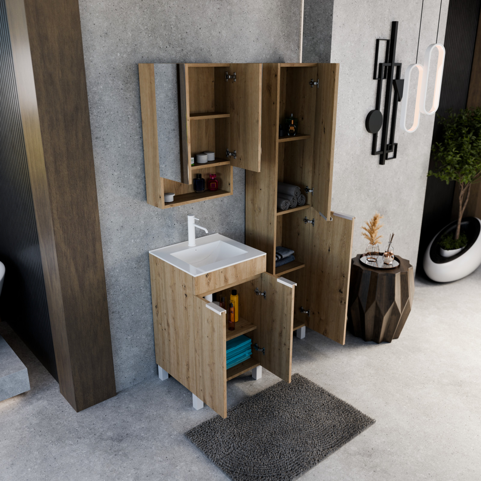 Saját márkás 60 cm széles komplett fürdőszoba bútor álló mosdószekrénnyel tölgyfa színben, matt fehér fogantyúkkal és lábakkal, tükrös szekrénnyel és magasszekrénnyel.