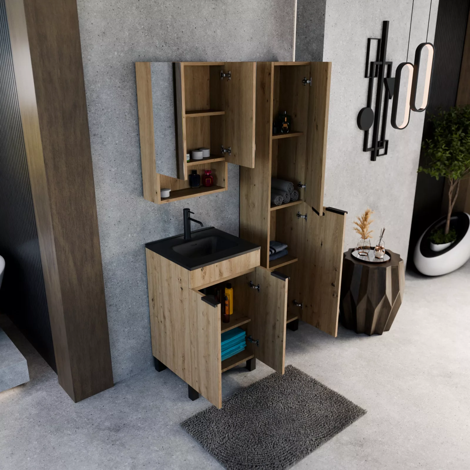 HD Paris Oak 50 komplett fürdőszoba bútor szett álló mosdószekrénnyel, matt fekete elemekkel, matt fekete slim mosdóval, tükrös szekrénnyel és magasszekrénnyel