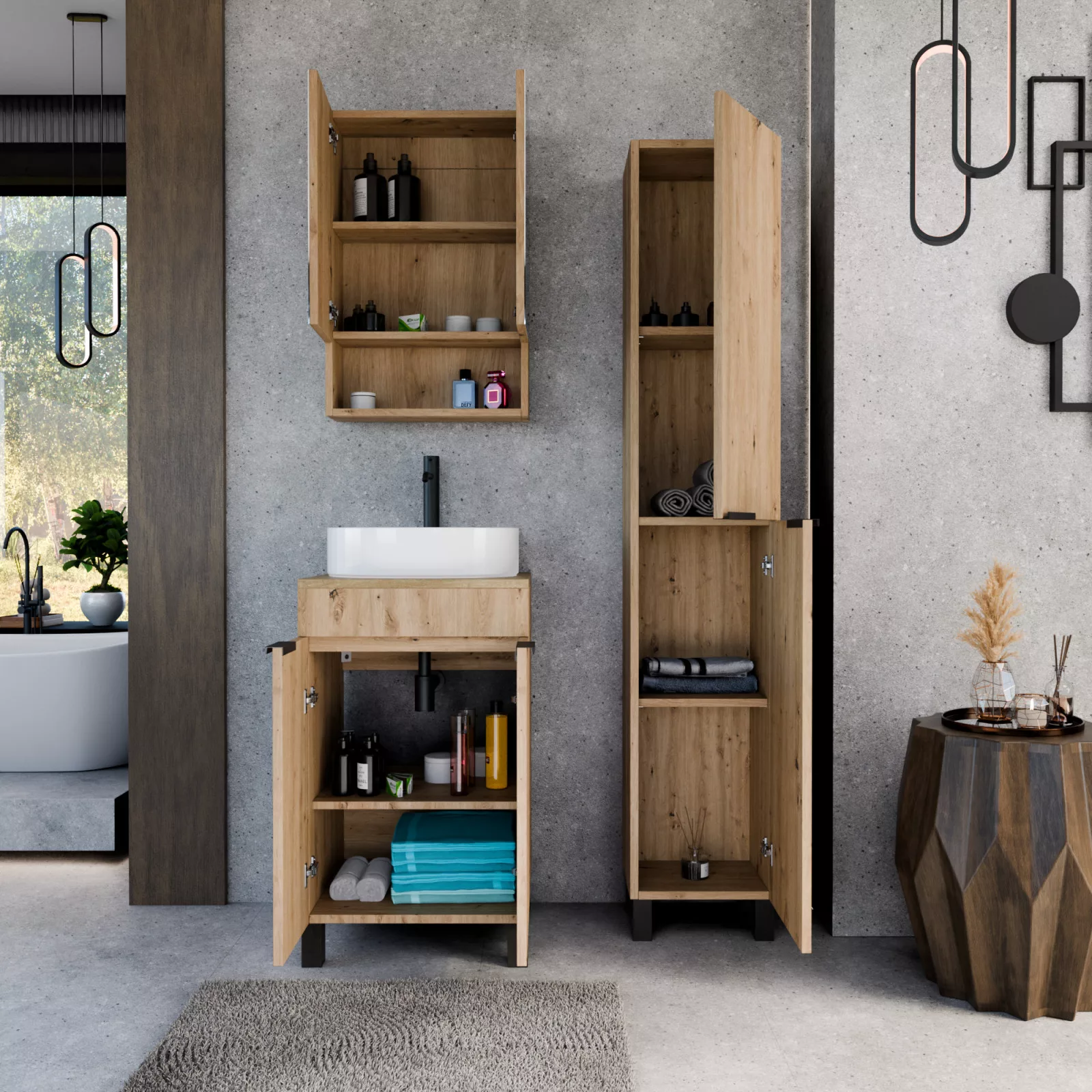 HD Paris Oak 50 komplett fürdőszoba bútor szett álló mosdószekrénnyel, matt fekete elemekkel, tölgyfa színű mosdópulttal, tükrös szekrénnyel és magasszekrénnyel