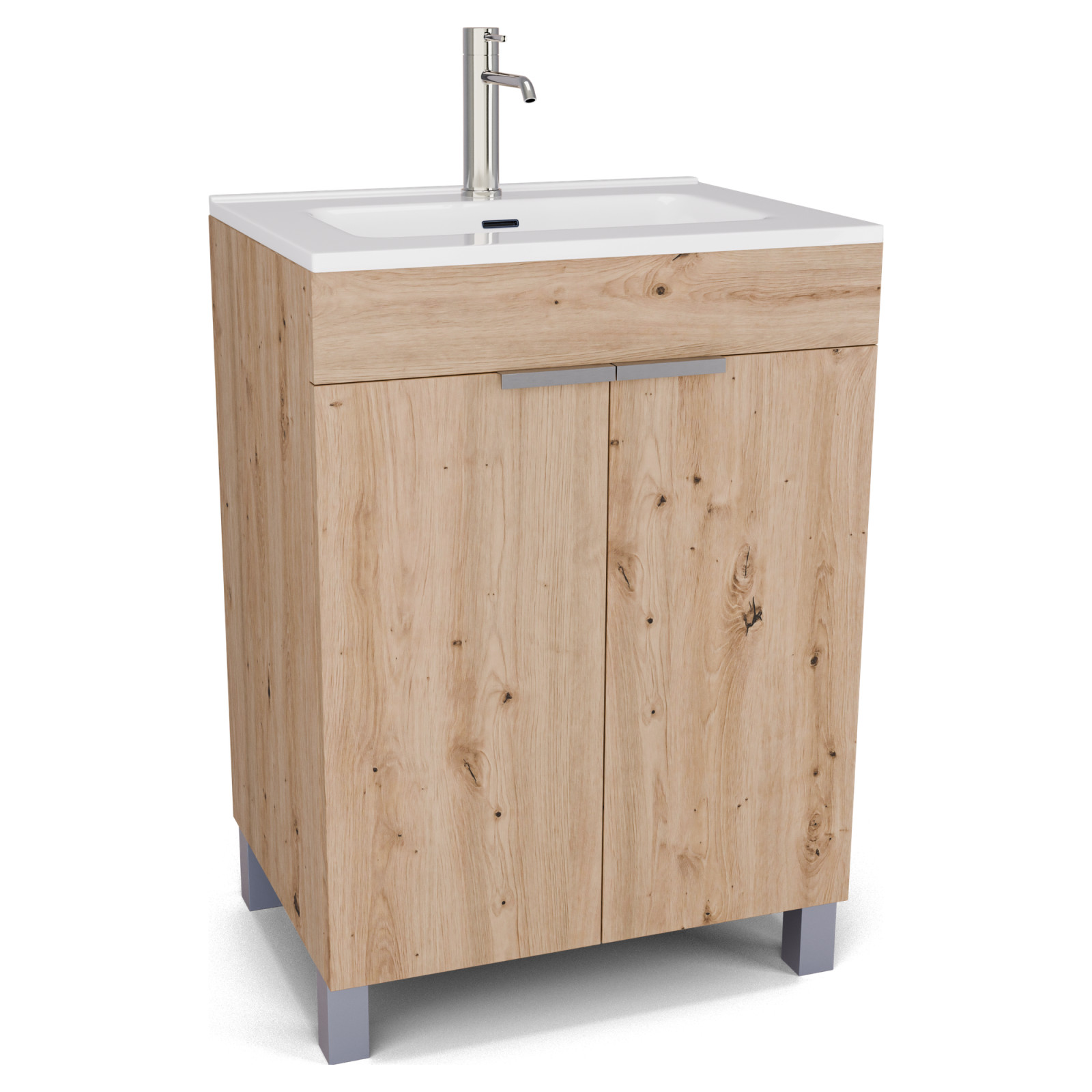 Saját márkás 60 cm széles álló mosdószekrény tölgyfa színben, szálcsiszolt króm fogantyúkkal és lábakkal, soft-close zsanérokkal ellátva.