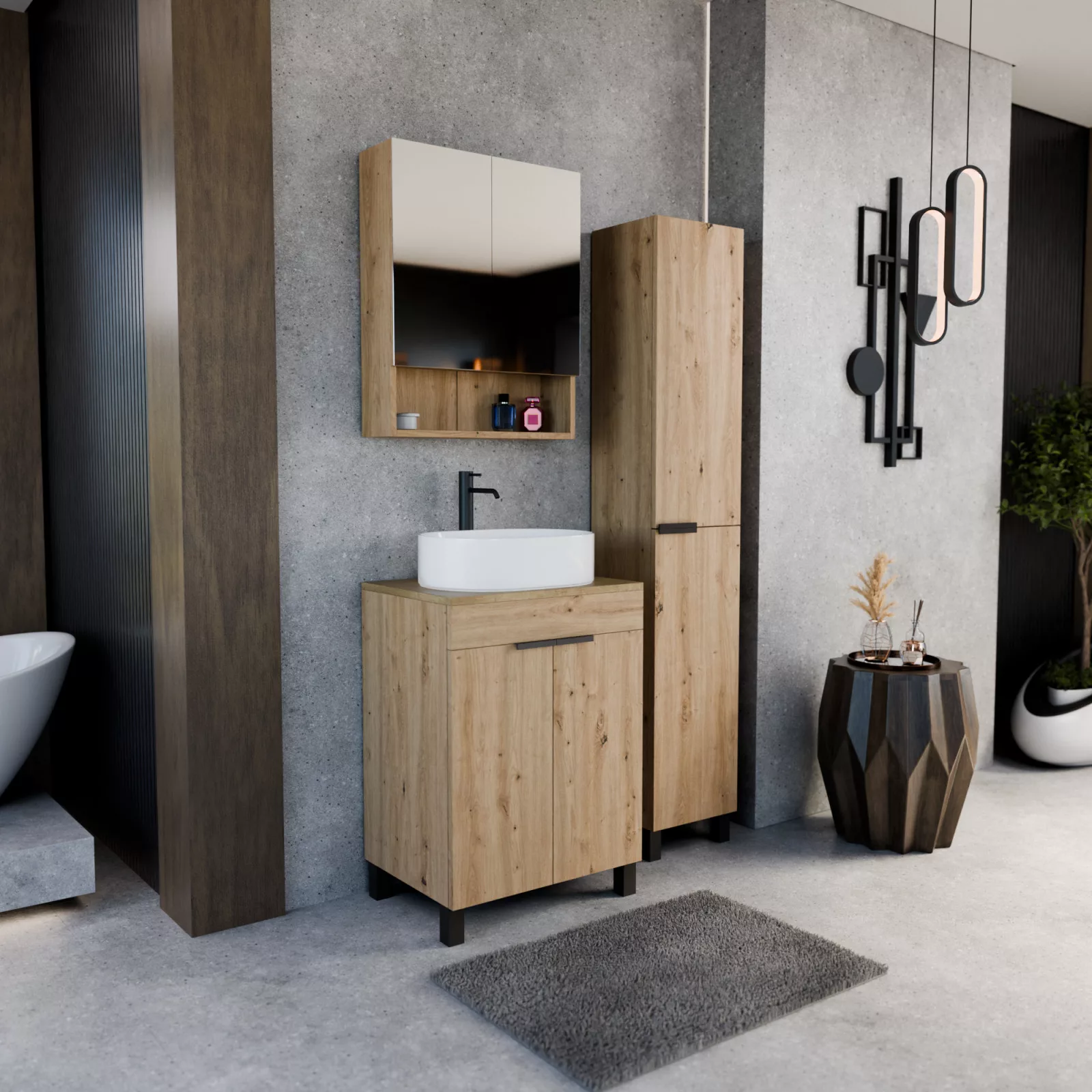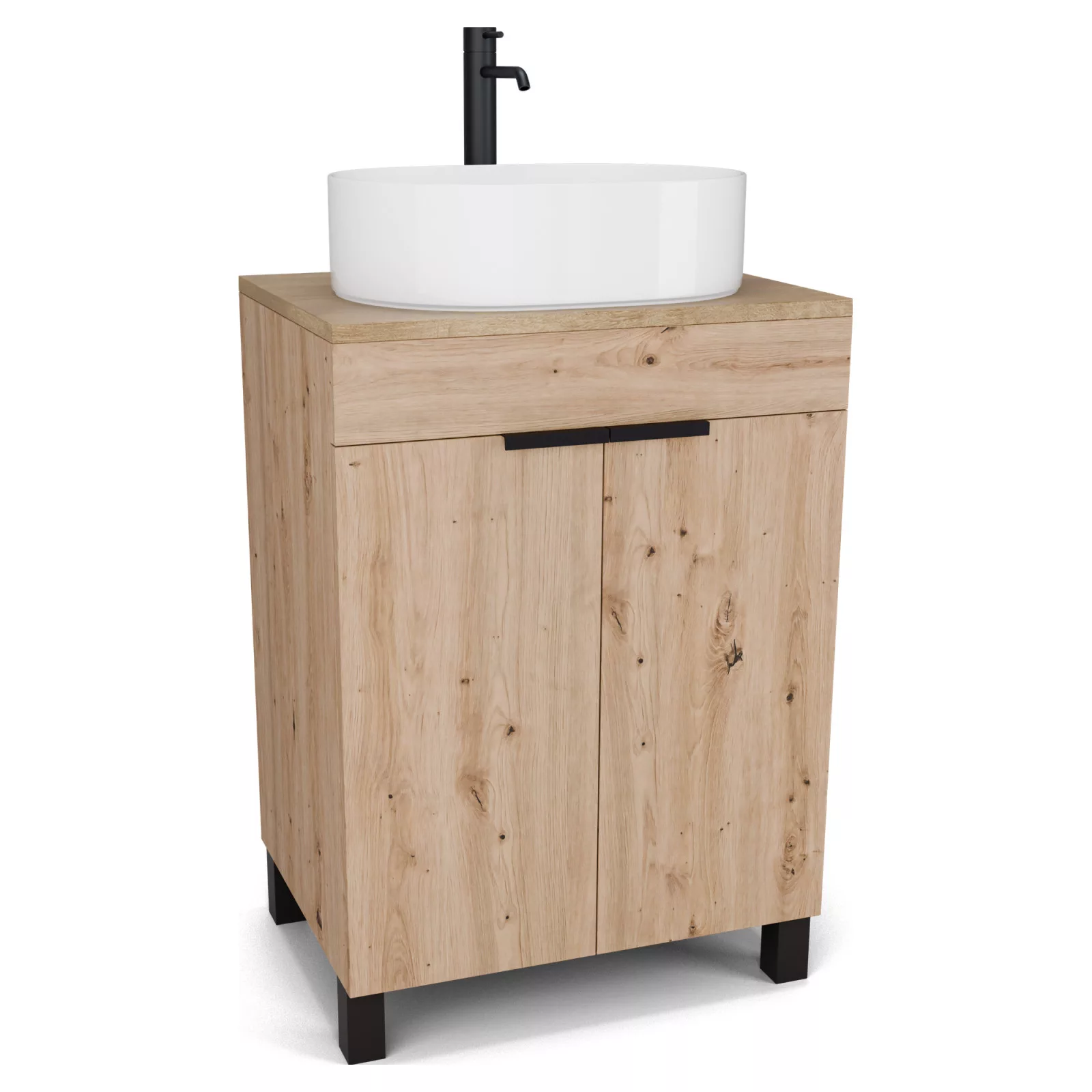 Saját márkás 60 cm széles álló mosdószekrény tölgyfa színben, matt fekete fogantyúkkal és lábakkal, tölgyfa színű mosdópulttal, soft-close zsanérokkal ellátva.