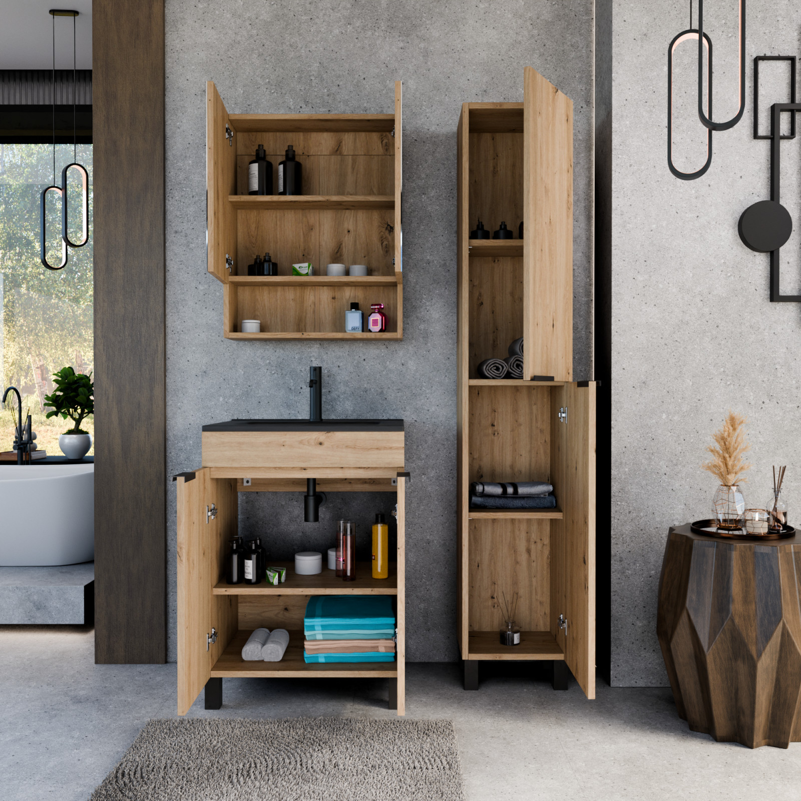 Saját márkás 60 cm széles komplett fürdőszoba bútor álló mosdószekrénnyel tölgyfa színben, matt fekete fogantyúkkal és lábakkal, tükrös szekrénnyel és magasszekrénnyel.