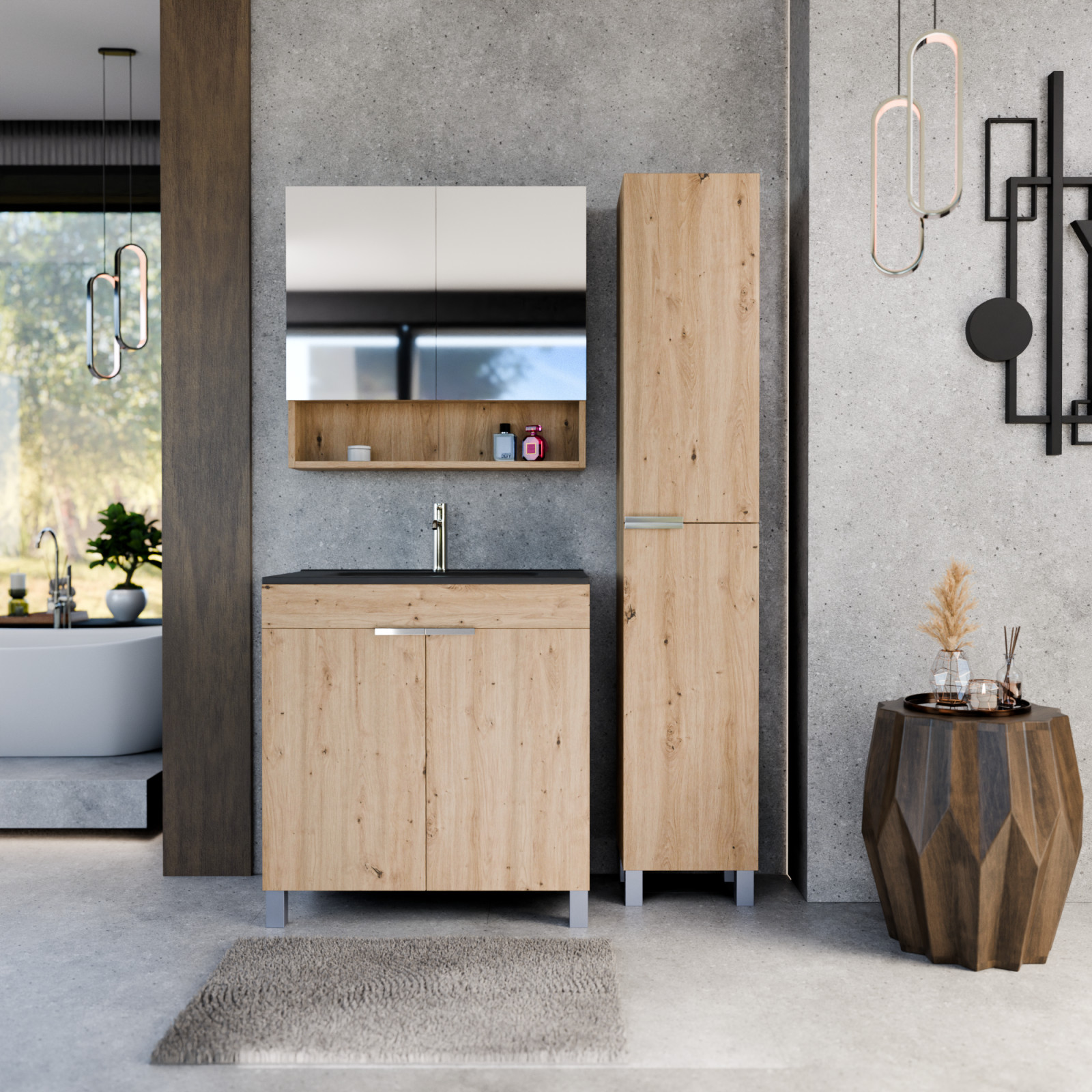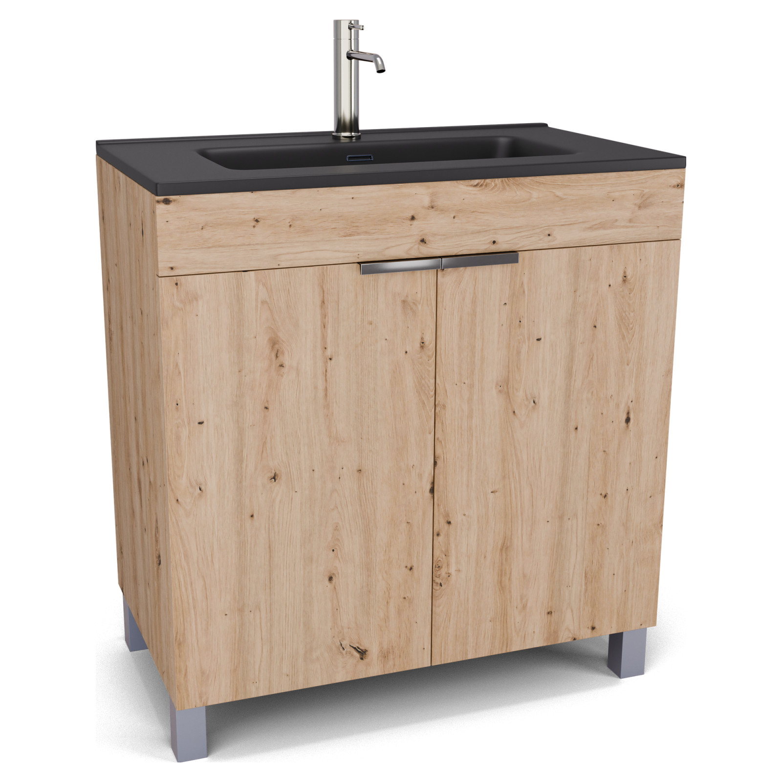 Saját márkás 80 cm széles álló mosdószekrény tölgyfa színben, fényes króm fogantyúkkal és lábakkal, fekete slim mosdóval, soft-close zsanérokkal ellátva.
