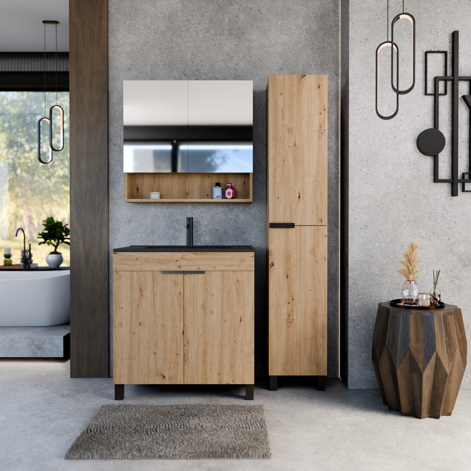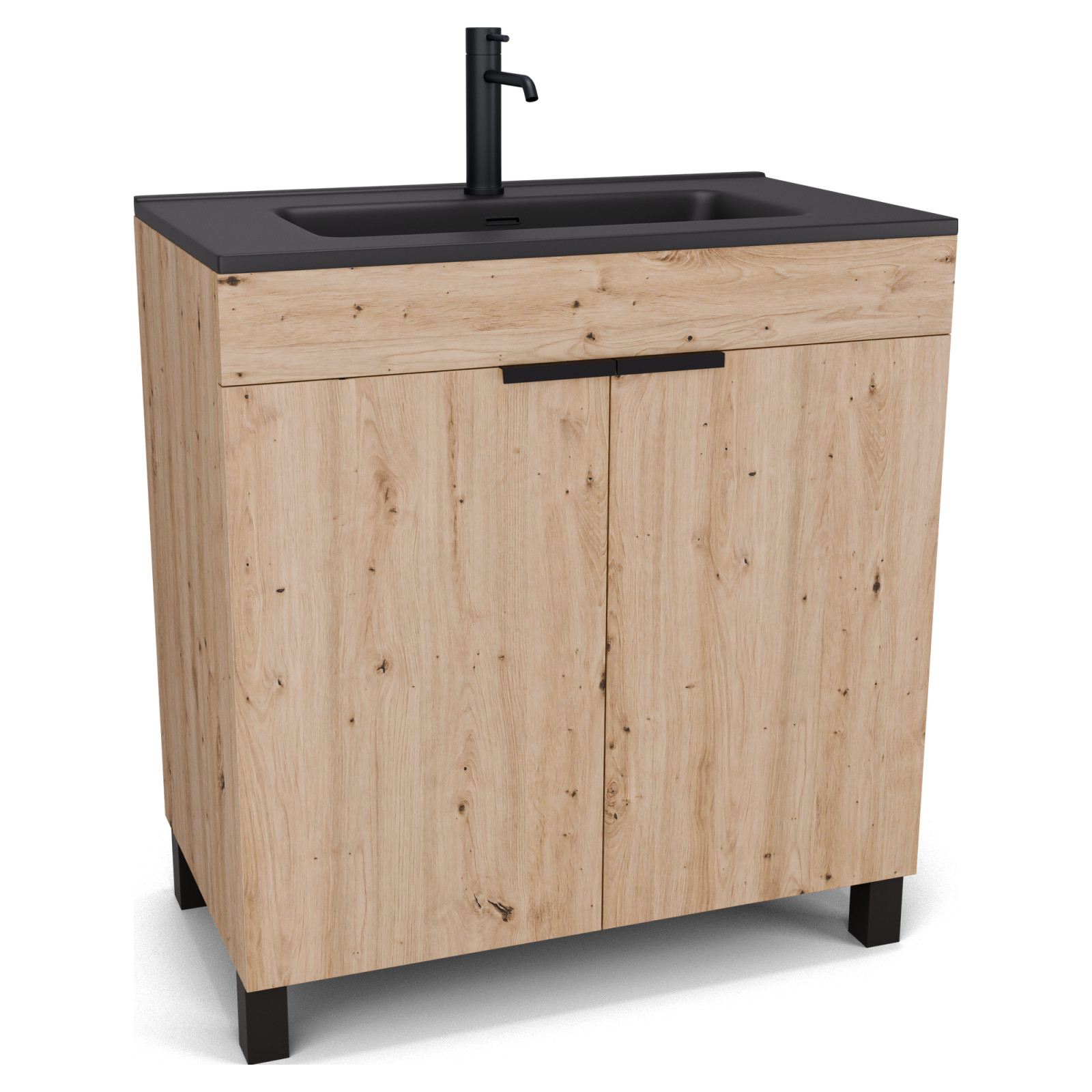 Paris Oak 80 mosdószekrény, mosdóval, matt fekete fogantyúkkal és lábakkal