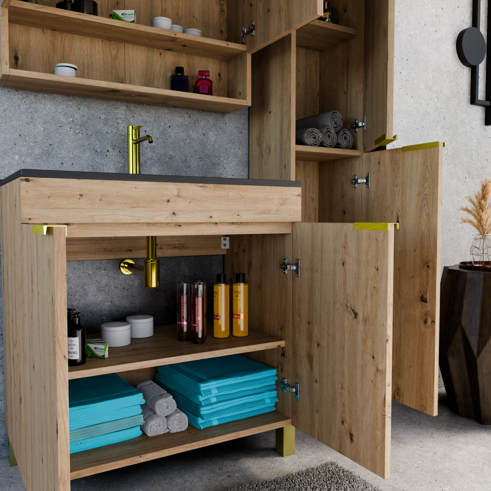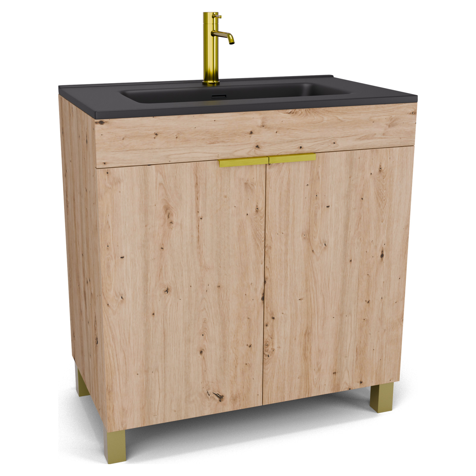 Saját márkás 80 cm széles álló mosdószekrény tölgyfa színben, szálcsiszolt arany fogantyúkkal és lábakkal, fekete slim mosdóval, soft-close zsanérokkal ellátva.