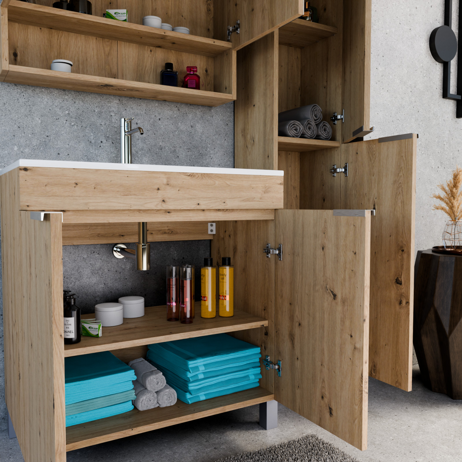Paris Oak 80 komplett fürdőszoba bútor, szálcsiszolt króm fogantyúkkal és lábakkal