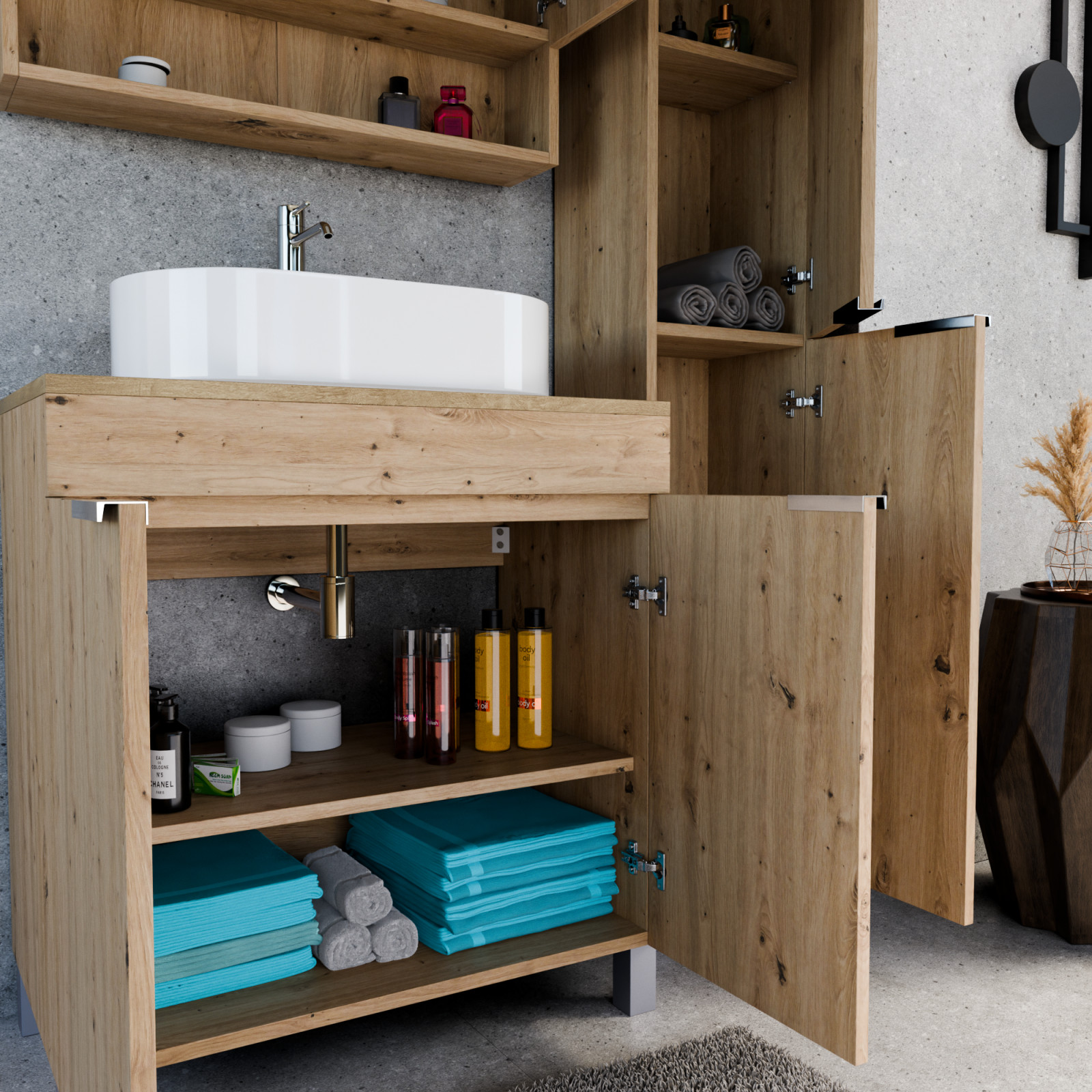 Saját márkás 80 cm széles komplett fürdőszoba bútor álló mosdószekrénnyel tölgyfa színben, fényes króm fogantyúkkal és lábakkal, tölgyfa színű mosdópulttal, tükrös szekrénnyel és magasszekrénnyel.