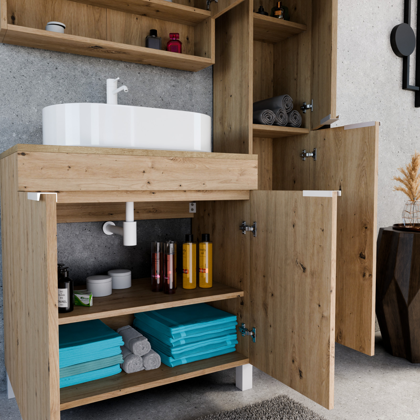 Paris Oak 80 komplett fürdőszoba bútor szett, matt fehér fogantyúkkal