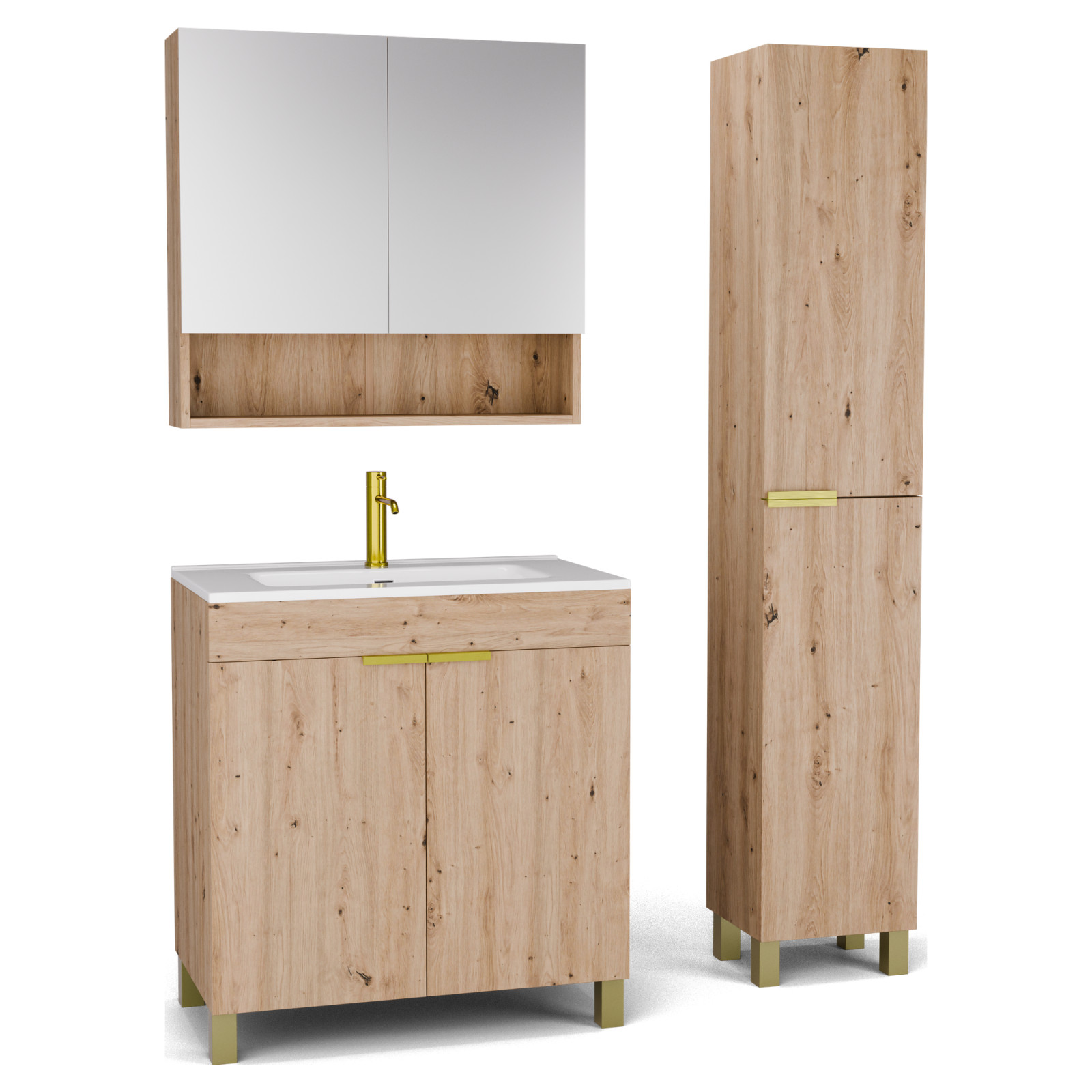 Saját márkás 80 cm széles komplett fürdőszoba bútor álló mosdószekrénnyel tölgyfa színben, szálcsiszolt arany fogantyúkkal és lábakkal, tükrös szekrénnyel és magasszekrénnyel.
