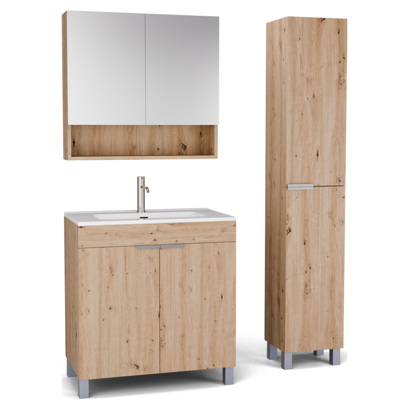 HD Paris Oak 80 komplett fürdőszoba bútor szett álló mosdószekrénnyel, szálcsiszolt króm elemekkel, tükrös szekrénnyel és magasszekrénnyel