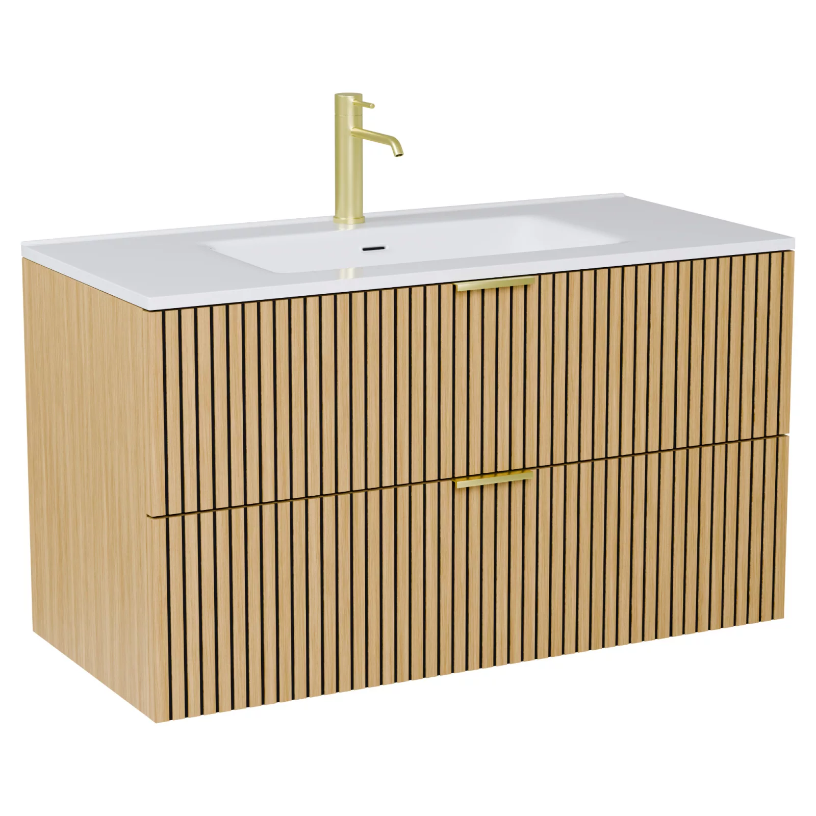 Saját márkás 100 cm széles fali mosdószekrény hikoridió színben, bordázott hikoridió színű fiók fronttal, szálcsiszolt arany fogantyúkkal, rejtett fióksínnel és önbehúzos technológiával ellátott.