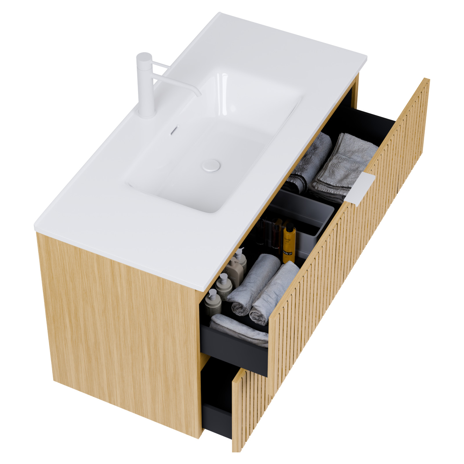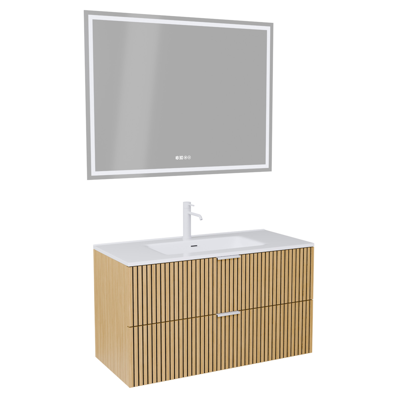 Saját márkás 100 cm széles komplett fürdőszoba bútor fali mosdószekrénnyel hikoridió színben, bordázott hikoridió színű fiók fronttal, matt fehér fogantyúkkal, fényes fehér slim mosdóval és fali okos LED tükörrel.