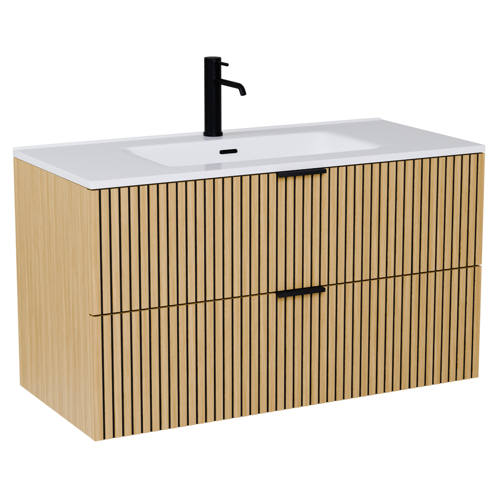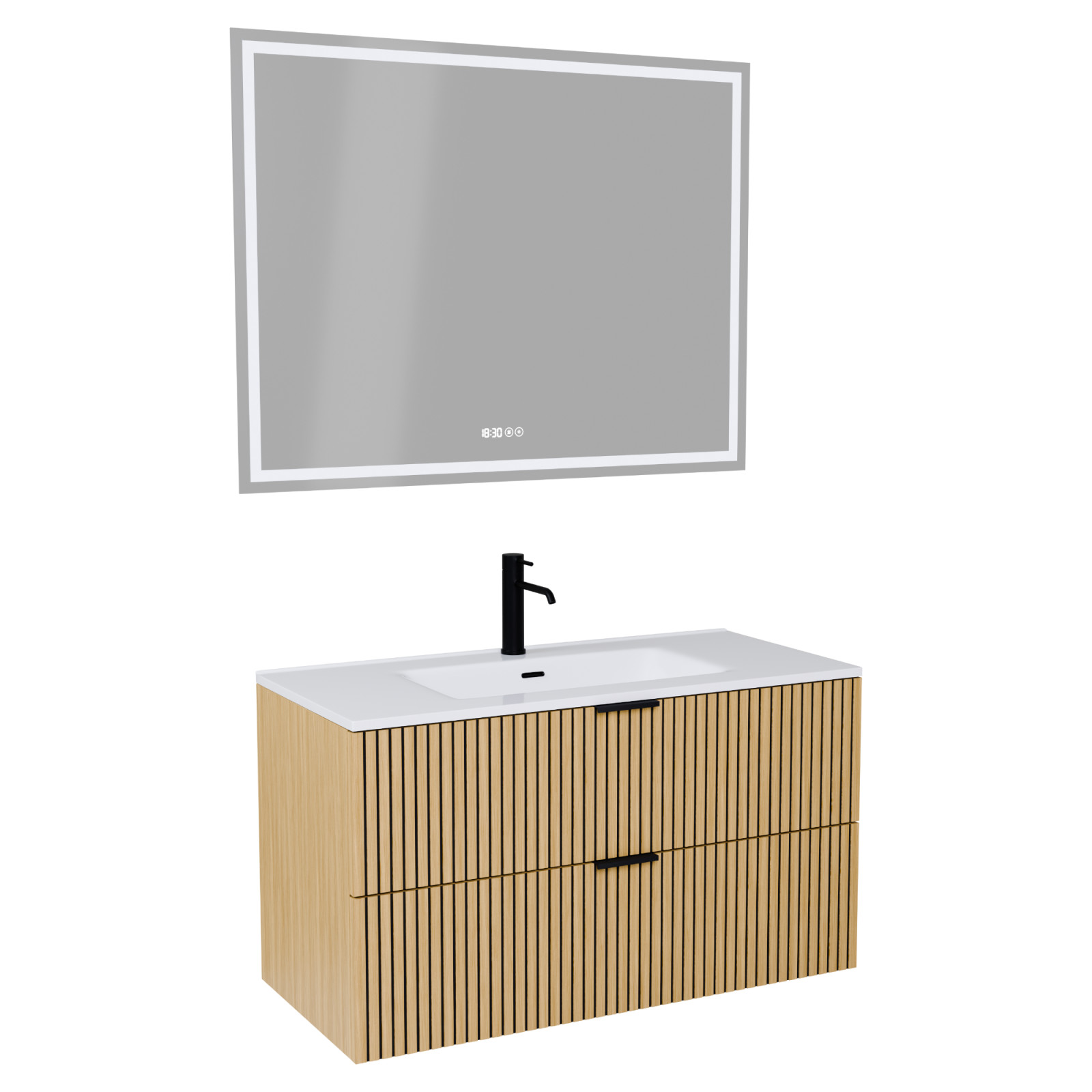 Saját márkás 100 cm széles komplett fürdőszoba bútor fali mosdószekrénnyel hikoridió színben, bordázott hikoridió színű fiók fronttal, matt fekete fogantyúkkal, fényes fehér slim mosdóval és fali okos LED tükörrel.