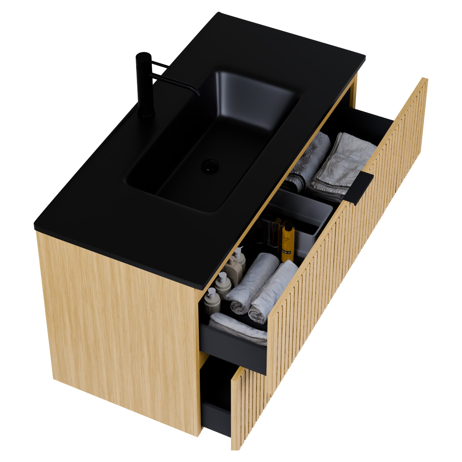 Saját márkás 100 cm széles komplett fürdőszoba bútor fali mosdószekrénnyel hikoridió színben, bordázott hikoridió színű fiók fronttal, matt fekete fogantyúkkal, fekete slim mosdóval és fali okos LED tükörrel.