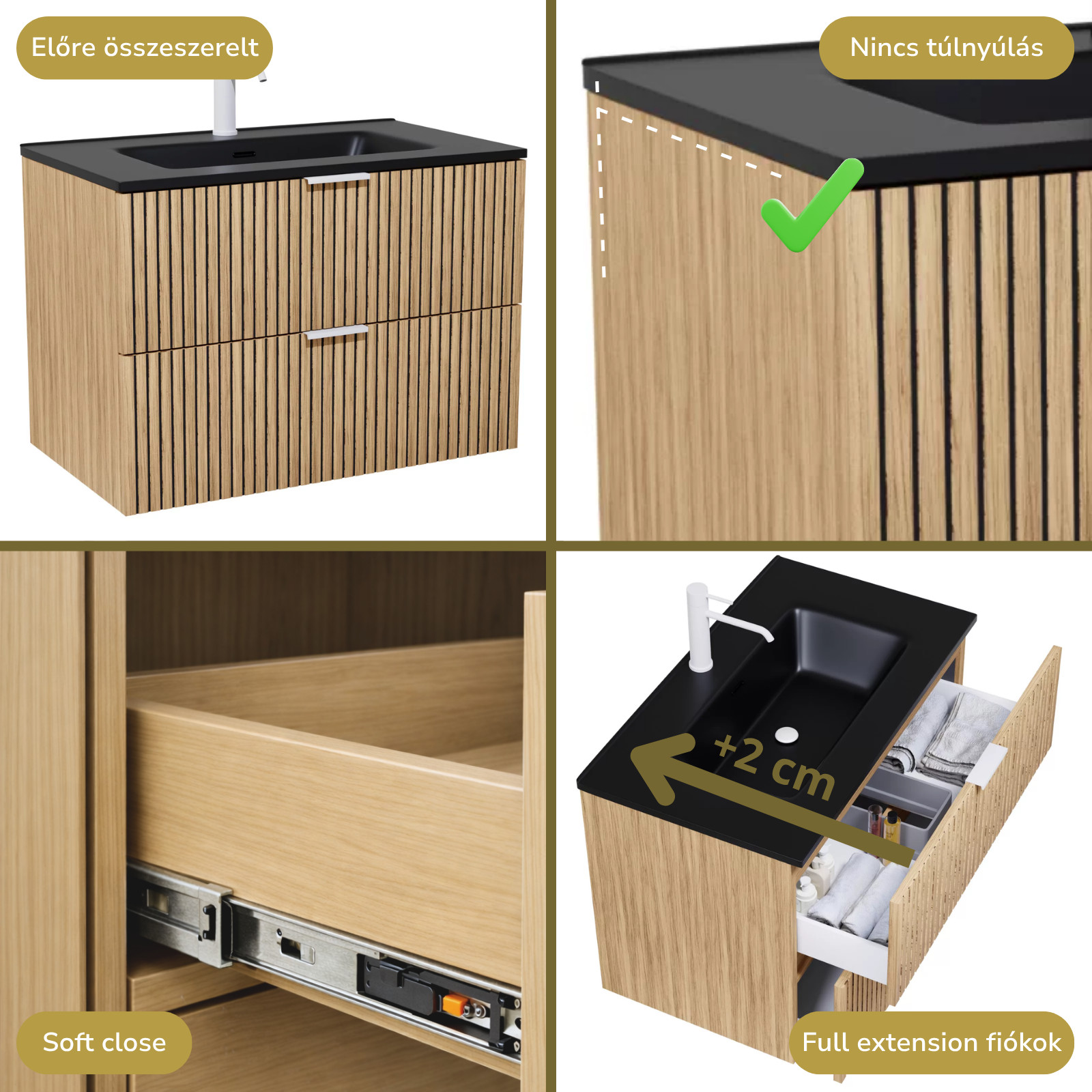 A teljes kihúzású fiók kiemelkedik praktikumával, maximális helykihasználásával és kifinomult működésével a bútorok terén. Kényelmes hozzáférést biztosít a teljes fióktérhez, miközben sima és stabil mozgást garantál. Tartós kialakítása és megbízható szerkezete hosszú távon is zavartalan használatot biztosít.