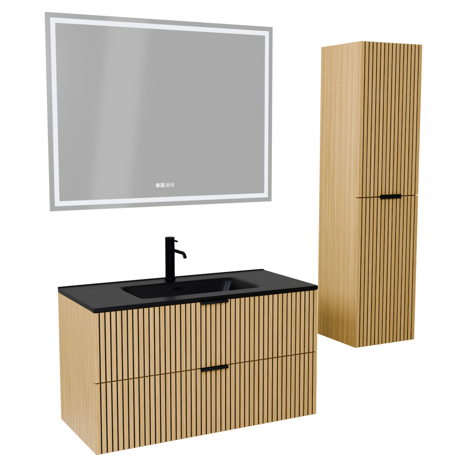 Parma Hickory 100 komplett fürdőszoba bútor szett, matt fekete fogantyúkkal