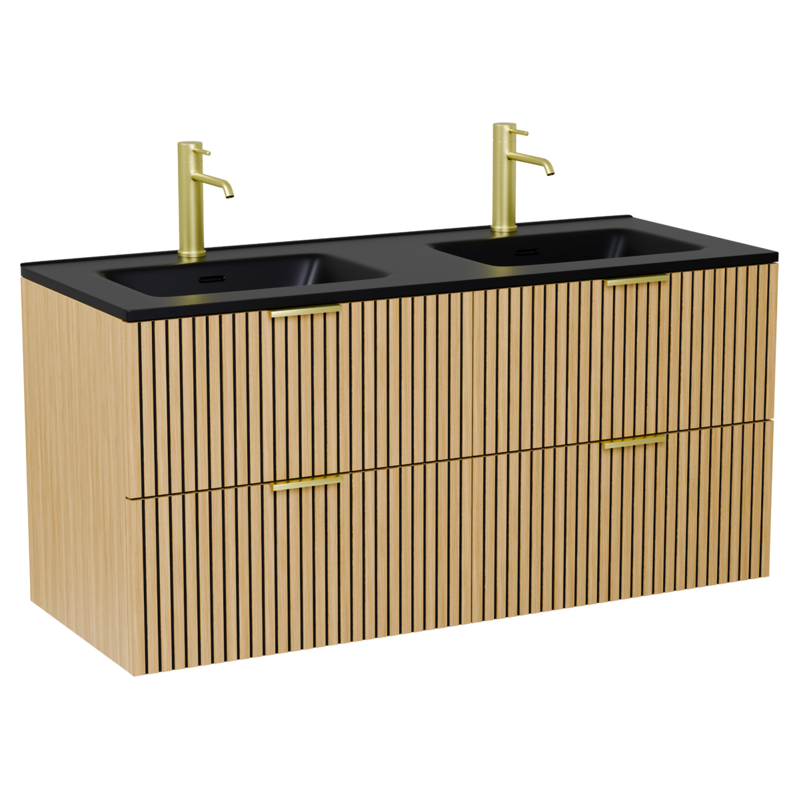 HD Parma Hickory 120 fali mosdószekrény szálcsiszolt arany fogantyúkkal és matt fekete slim mosdóval