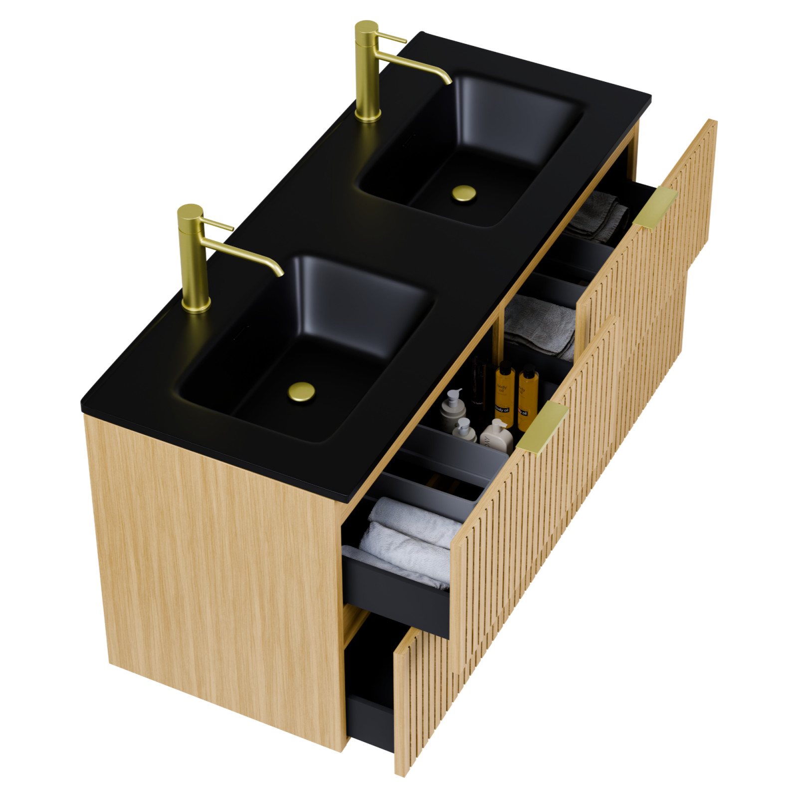 Saját márkás 120 cm széles fali mosdószekrény hikoridió színben, bordázott hikoridió színű fiók fronttal, szálcsiszolt arany fogantyúkkal, fekete slim mosdóval, rejtett fióksínnel és önbehúzos technológiával ellátott.