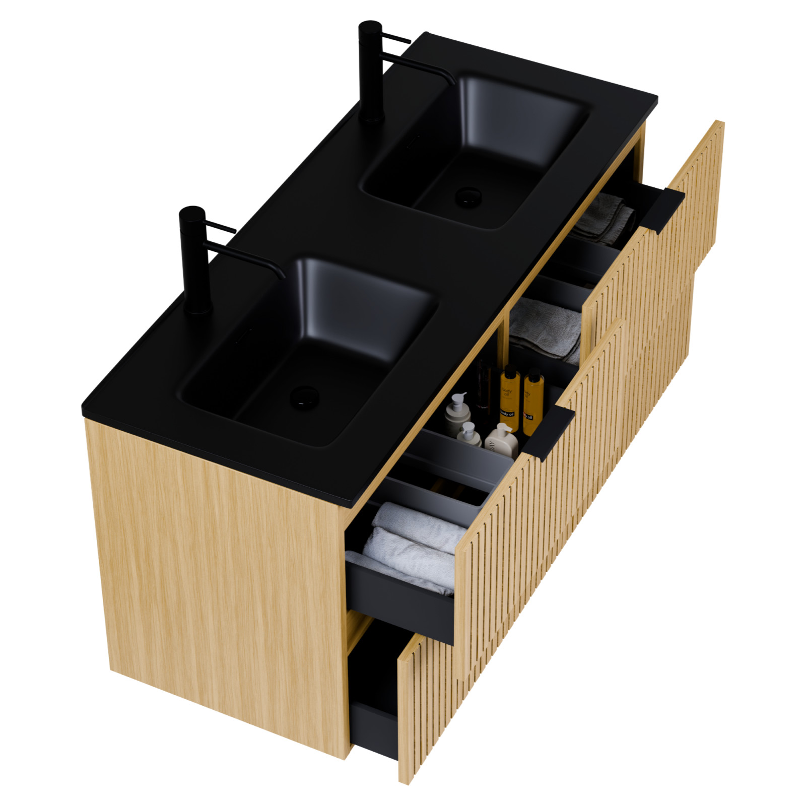 Saját márkás 120 cm széles fali mosdószekrény hikoridió színben, bordázott hikoridió színű fiók fronttal, matt fekete fogantyúkkal, fekete slim mosdóval, rejtett fióksínnel és önbehúzos technológiával ellátott.