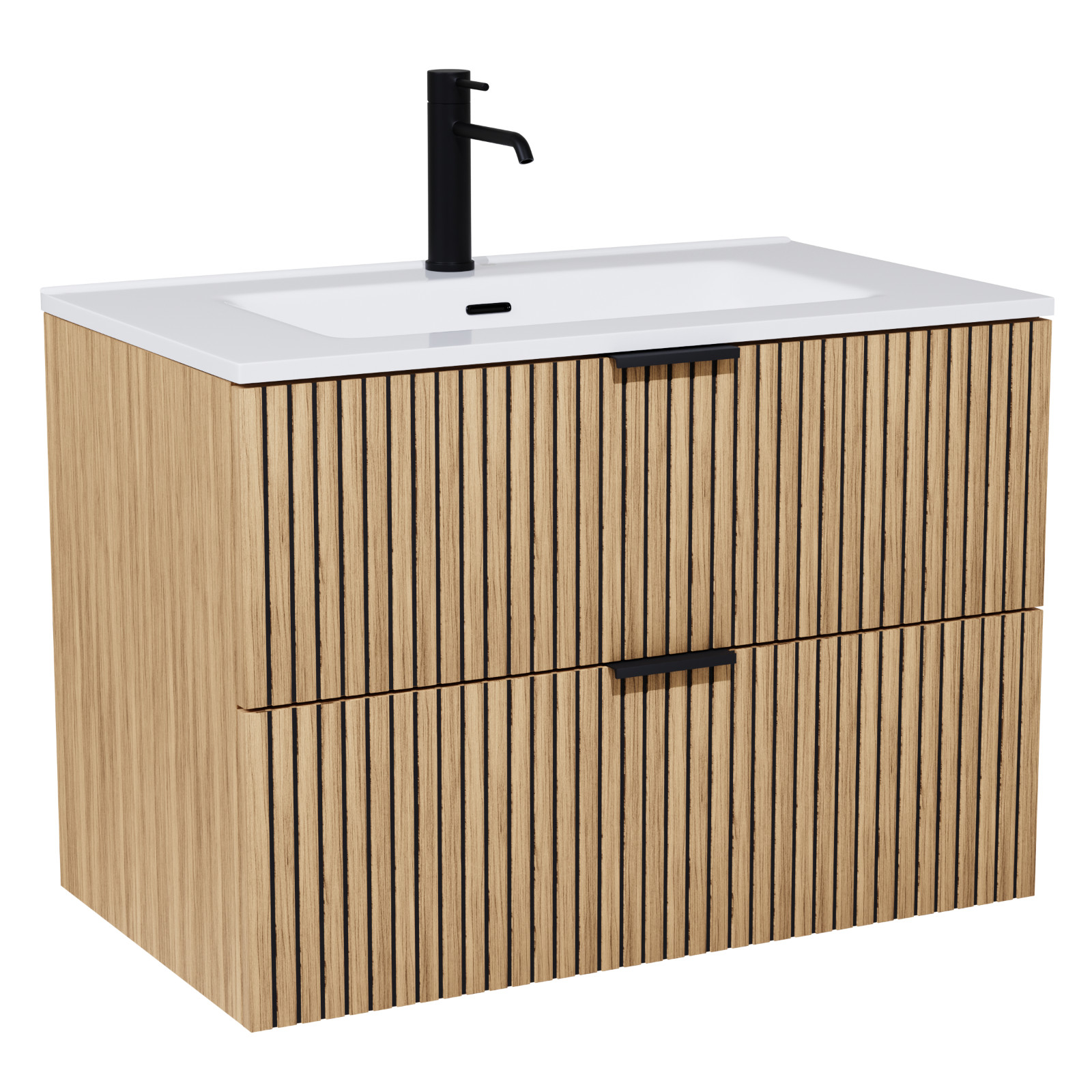 HD Parma Hickory 60 fali mosdószekrény matt fekete fogantyúkkal és fényes fehér slim mosdóval