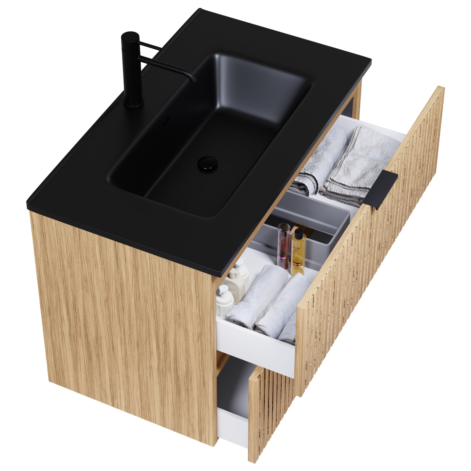 Saját márkás 60 cm széles fali mosdószekrény hikoridió színben, bordázott hikoridió színű fiók fronttal, matt fekete fogantyúkkal, fekete slim mosdóval, rejtett fióksínnel és önbehúzos technológiával ellátott.