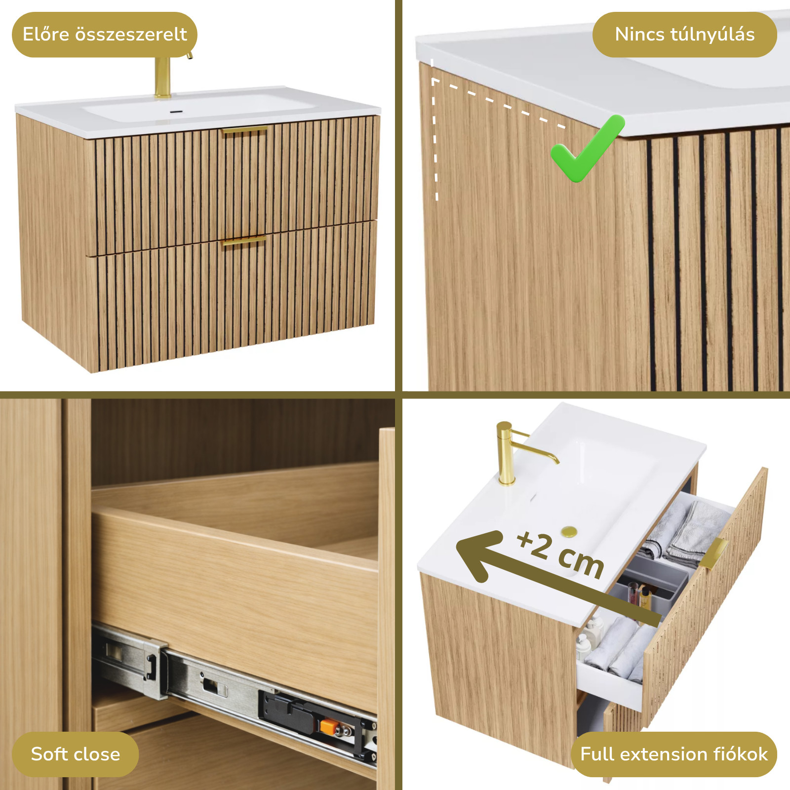 Saját márkás 80 cm széles fali mosdószekrény hikoridió színben, bordázott hikoridió színű fiók fronttal, szálcsiszolt arany fogantyúkkal, fényes fehér slim mosdóval, rejtett fióksínnel és önbehúzos technológiával ellátott.