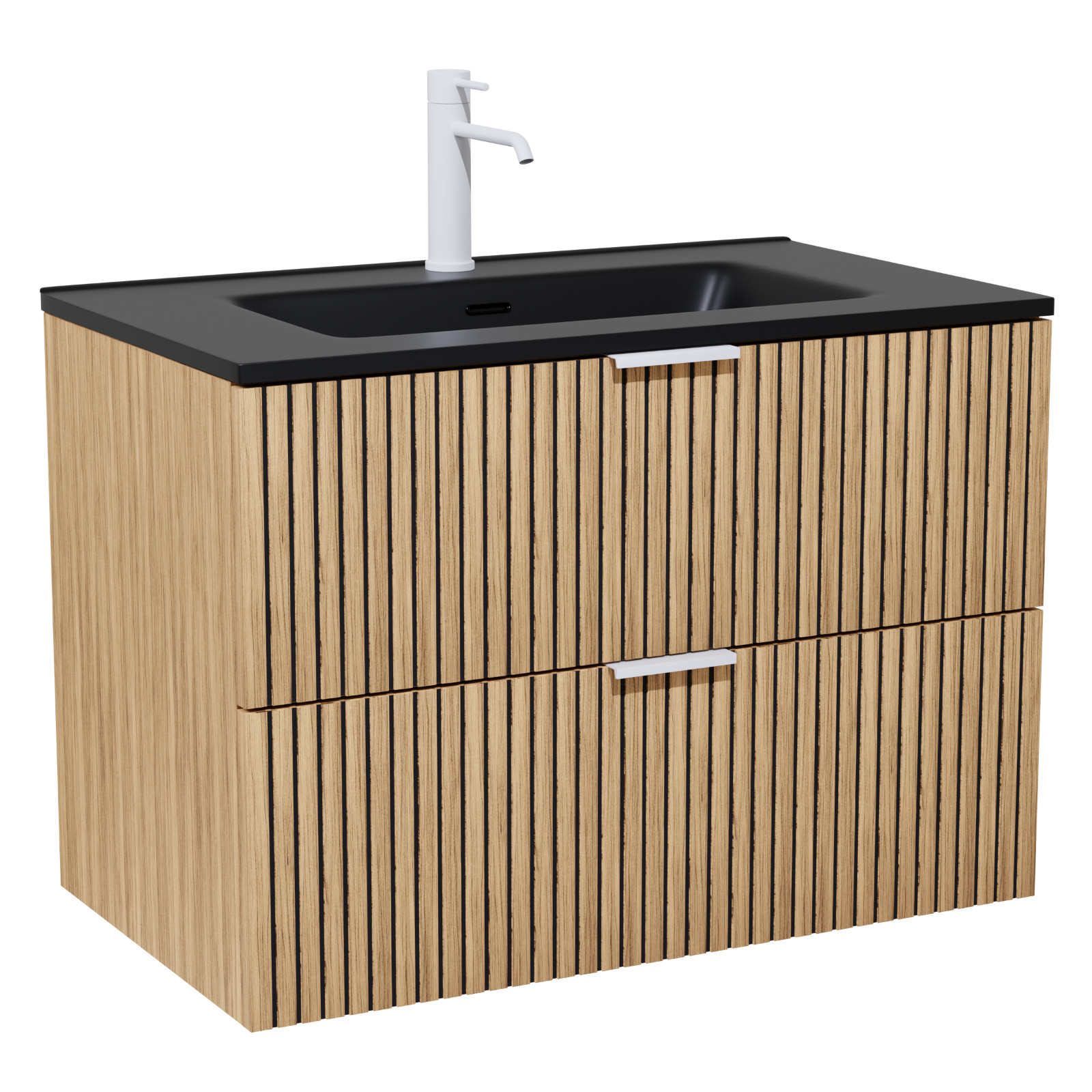 HD Parma Hickory 80 fali mosdószekrény matt fehér fogantyúkkal és matt fekete slim mosdóval