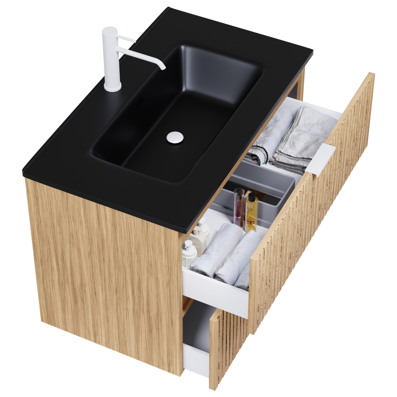 Saját márkás 80 cm széles fali mosdószekrény hikoridió színben, bordázott hikoridió színű fiók fronttal, matt fehér fogantyúkkal, fekete slim mosdóval, rejtett fióksínnel és önbehúzos technológiával ellátott.