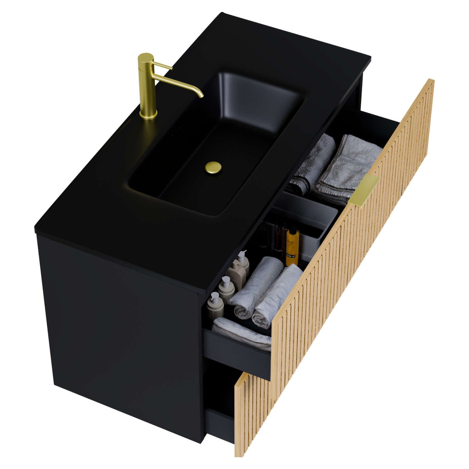 Saját márkás 100 cm széles fali mosdószekrény matt fekete színben, bordázott hikoridió színű fiók fronttal, szálcsiszolt arany fogantyúkkal, fekete slim mosdóval, rejtett fióksínnel és önbehúzos technológiával ellátott.
