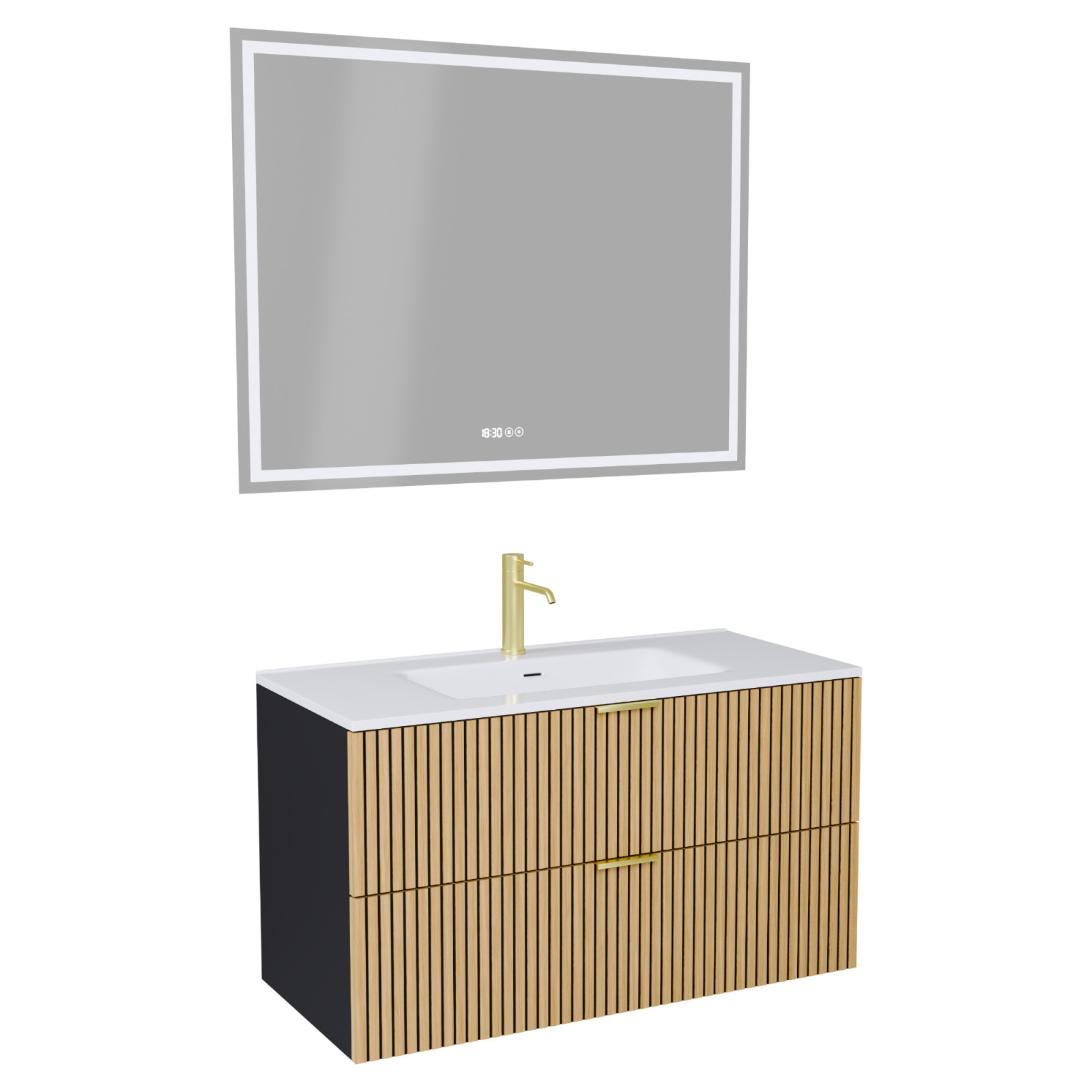 Saját márkás 100 cm széles komplett fürdőszoba bútor fali mosdószekrénnyel matt fekete színben, bordázott hikoridió színű fiók fronttal, szálcsiszolt arany fogantyúkkal, fényes fehér slim mosdóval és fali okos LED tükörrel.