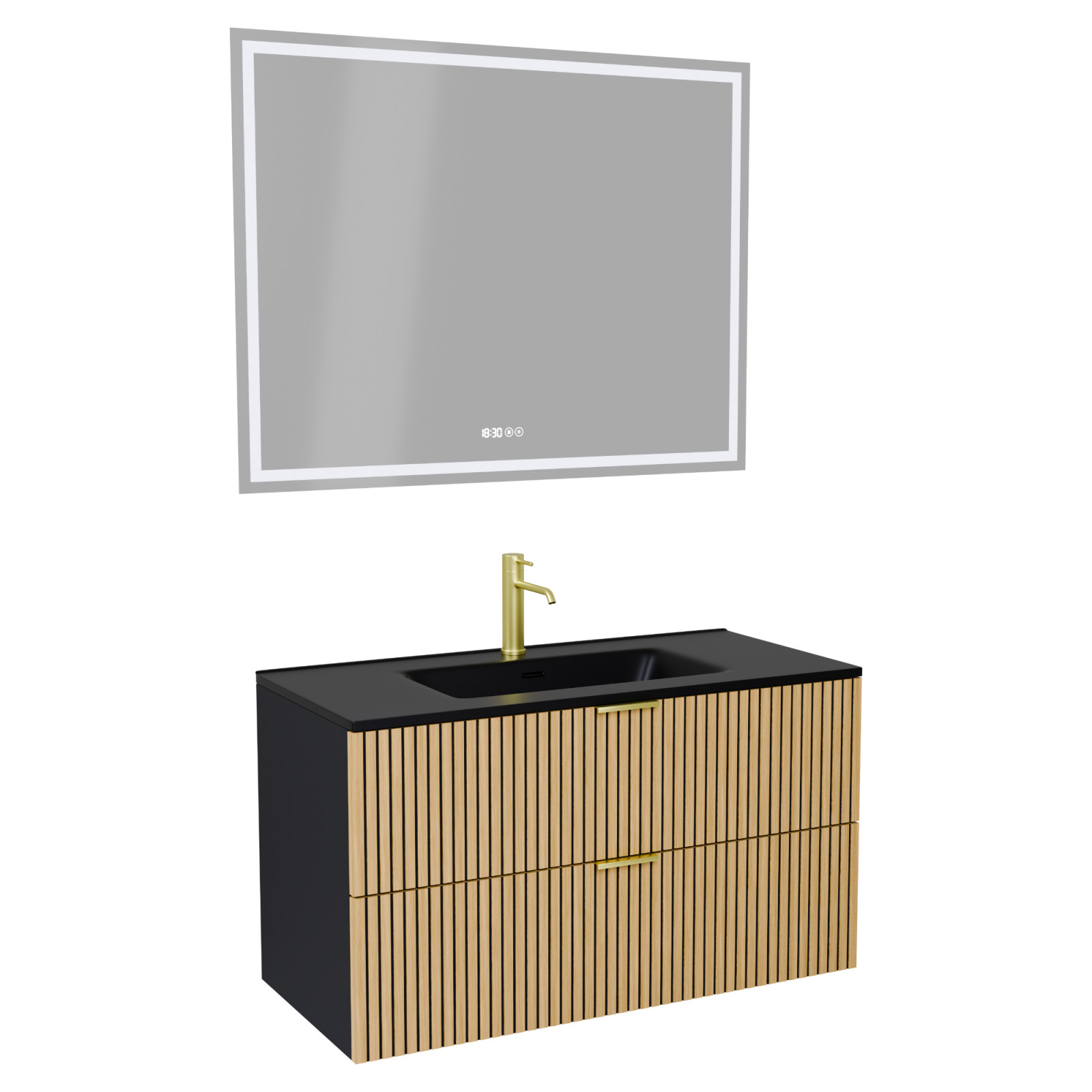 Saját márkás 100 cm széles komplett fürdőszoba bútor fali mosdószekrénnyel matt fekete színben, bordázott hikoridió színű fiók fronttal, szálcsiszolt arany fogantyúkkal, fekete slim mosdóval és fali okos LED tükörrel.
