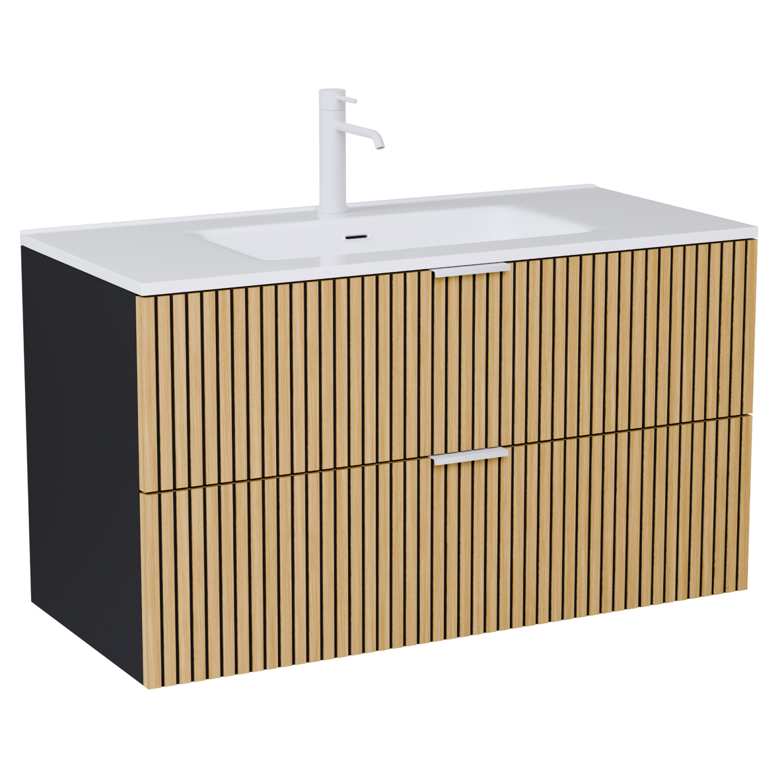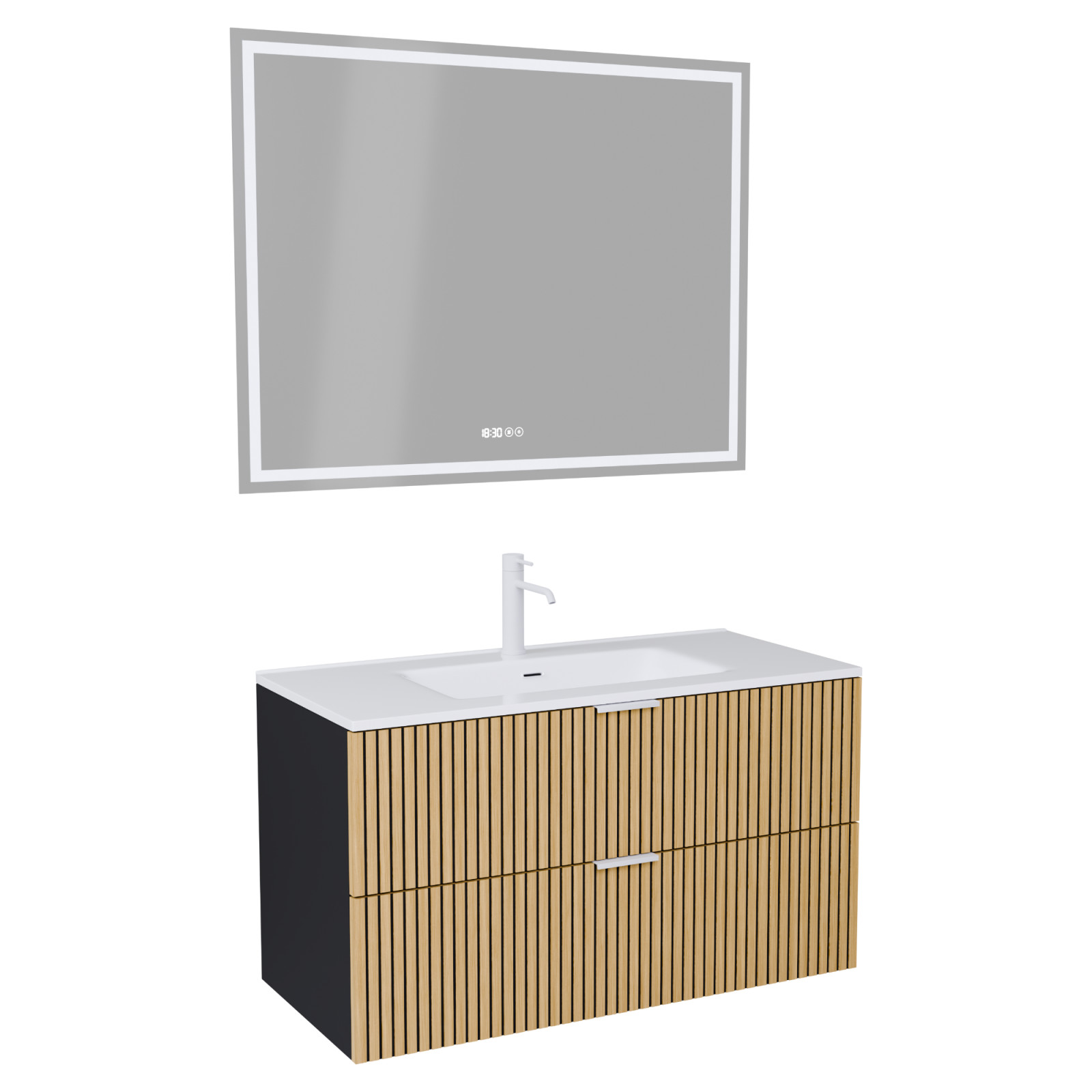 Saját márkás 100 cm széles komplett fürdőszoba bútor fali mosdószekrénnyel matt fekete színben, bordázott hikoridió színű fiók fronttal, matt fehér fogantyúkkal, fényes fehér slim mosdóval és fali okos LED tükörrel.
