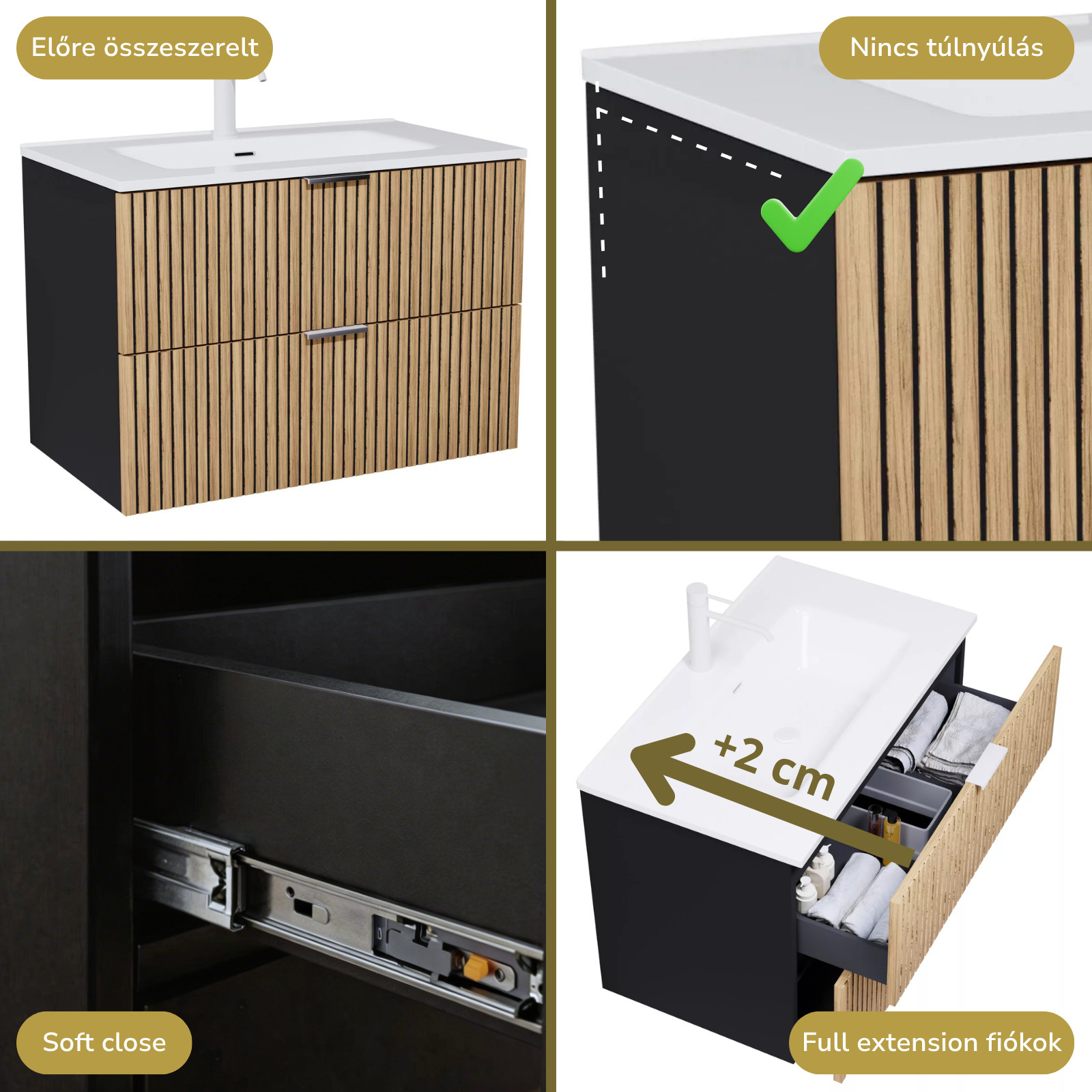 • matt fekete mosdószekrény, teljes kihúzhatóságú fiókokkal