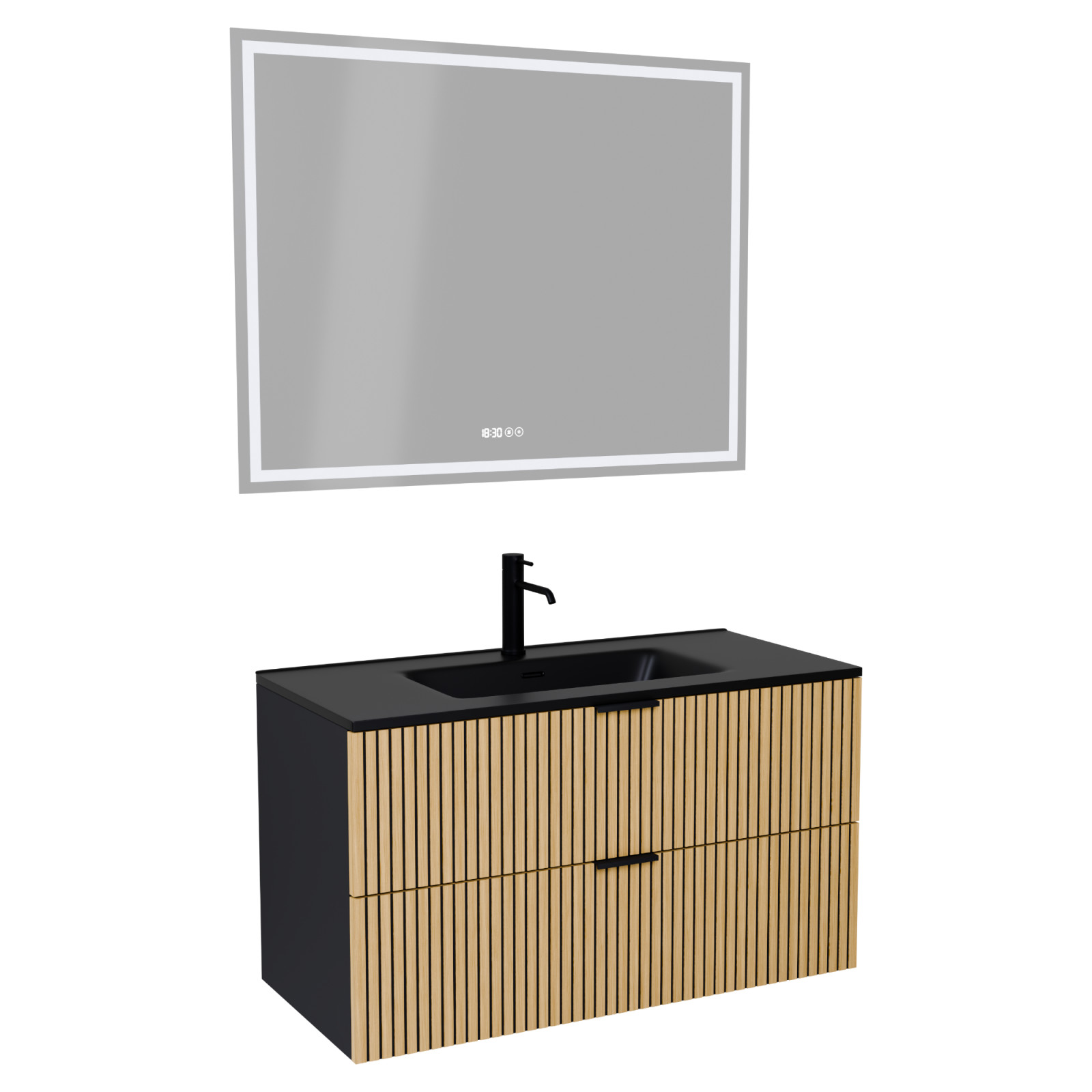 Saját márkás 100 cm széles komplett fürdőszoba bútor fali mosdószekrénnyel matt fekete színben, bordázott hikoridió színű fiók fronttal, matt fekete fogantyúkkal, fekete slim mosdóval és fali okos LED tükörrel.