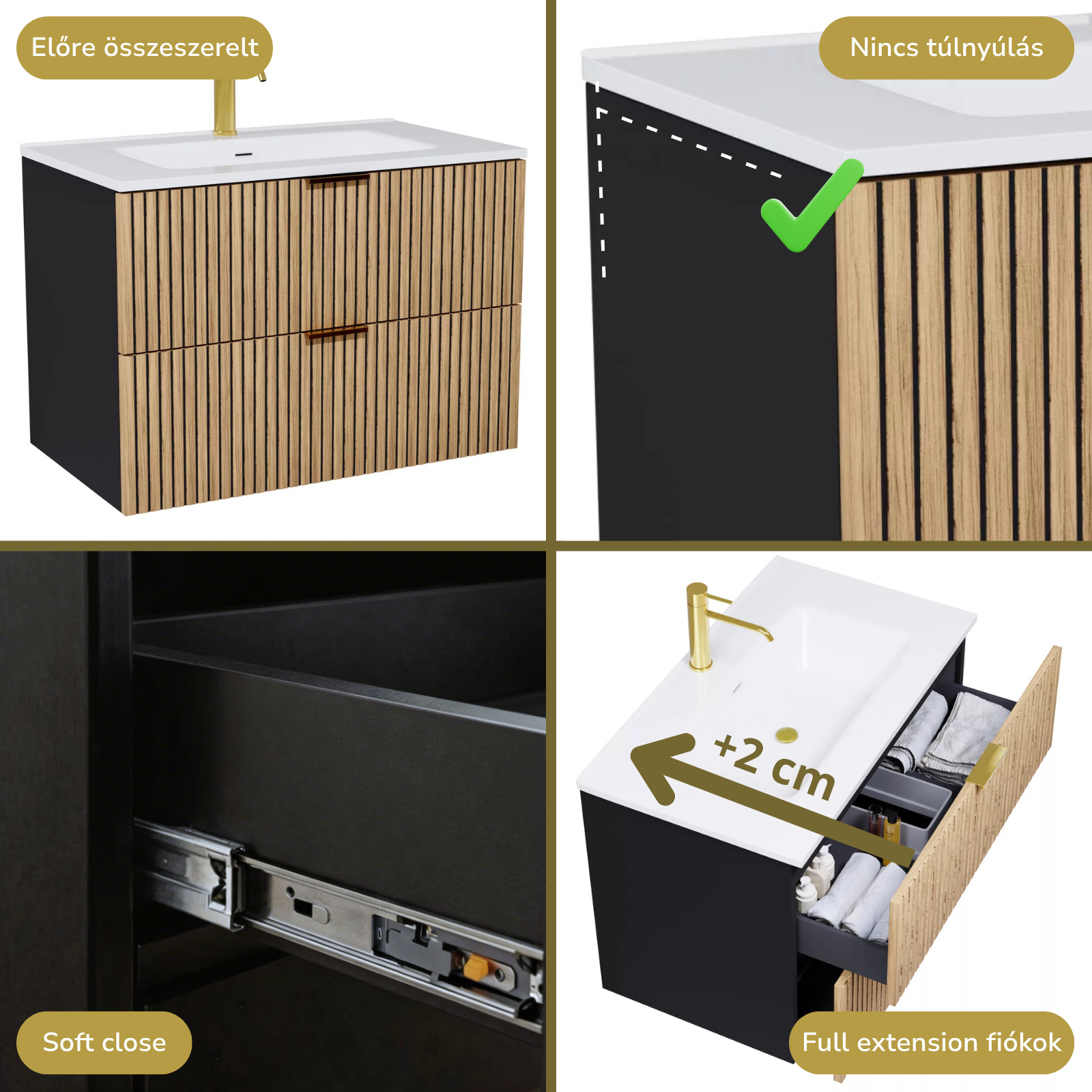 matt fekete mosdószekrény, teljes kihúzhatóságú fiókokkal