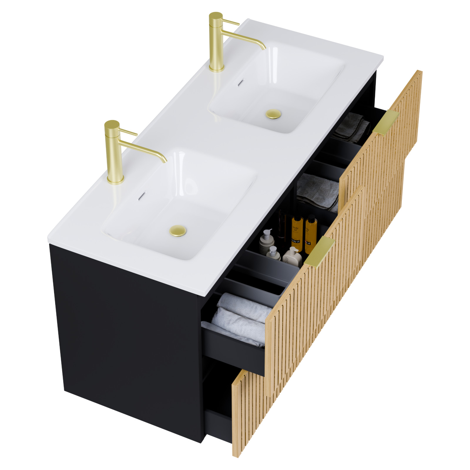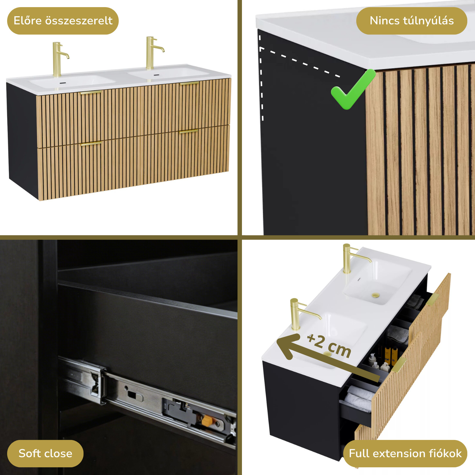 Saját márkás 120 cm széles fali mosdószekrény matt fekete színben, bordázott hikoridió színű fiók fronttal, szálcsiszolt arany fogantyúkkal, fényes fehér slim mosdóval, rejtett fióksínnel és önbehúzos technológiával ellátott.