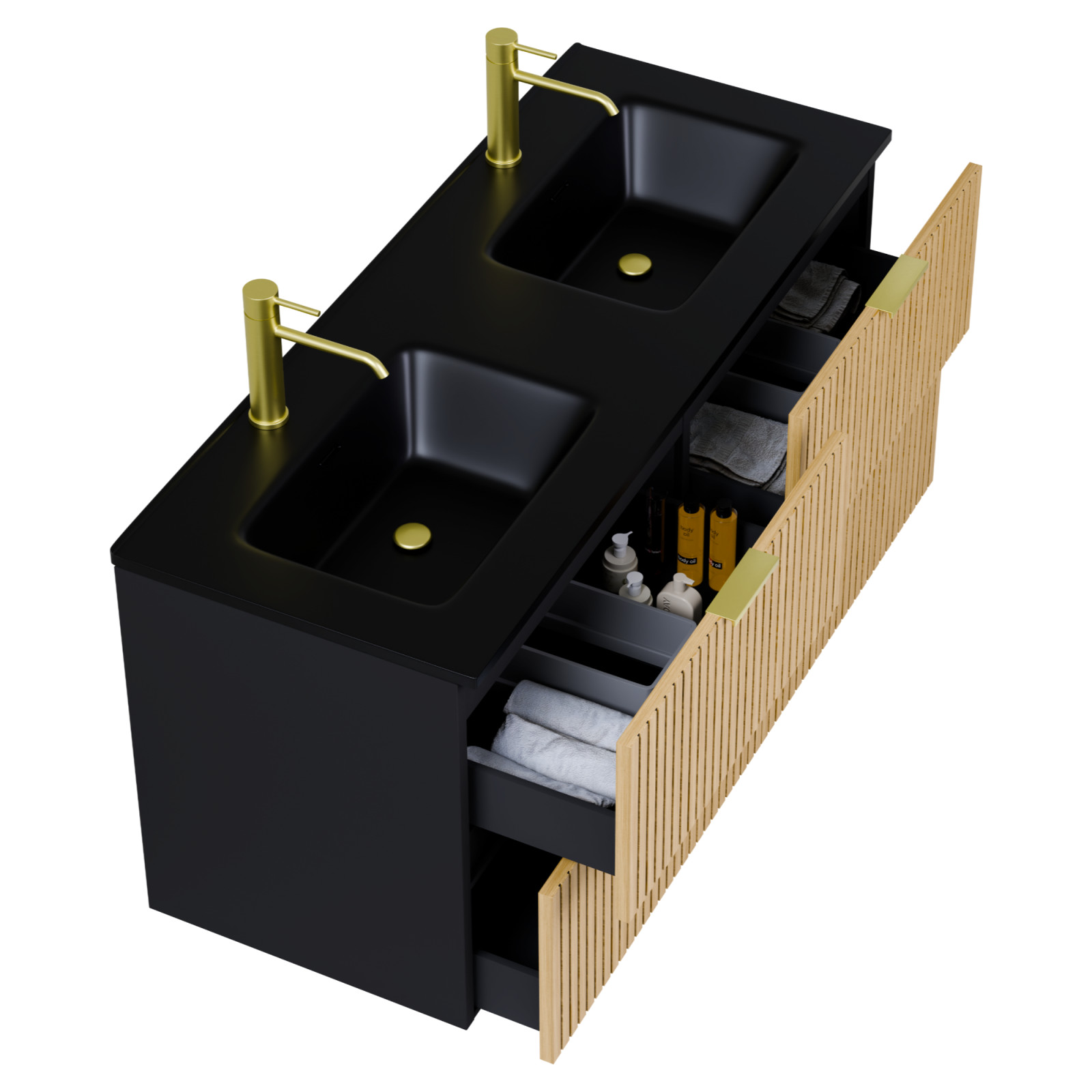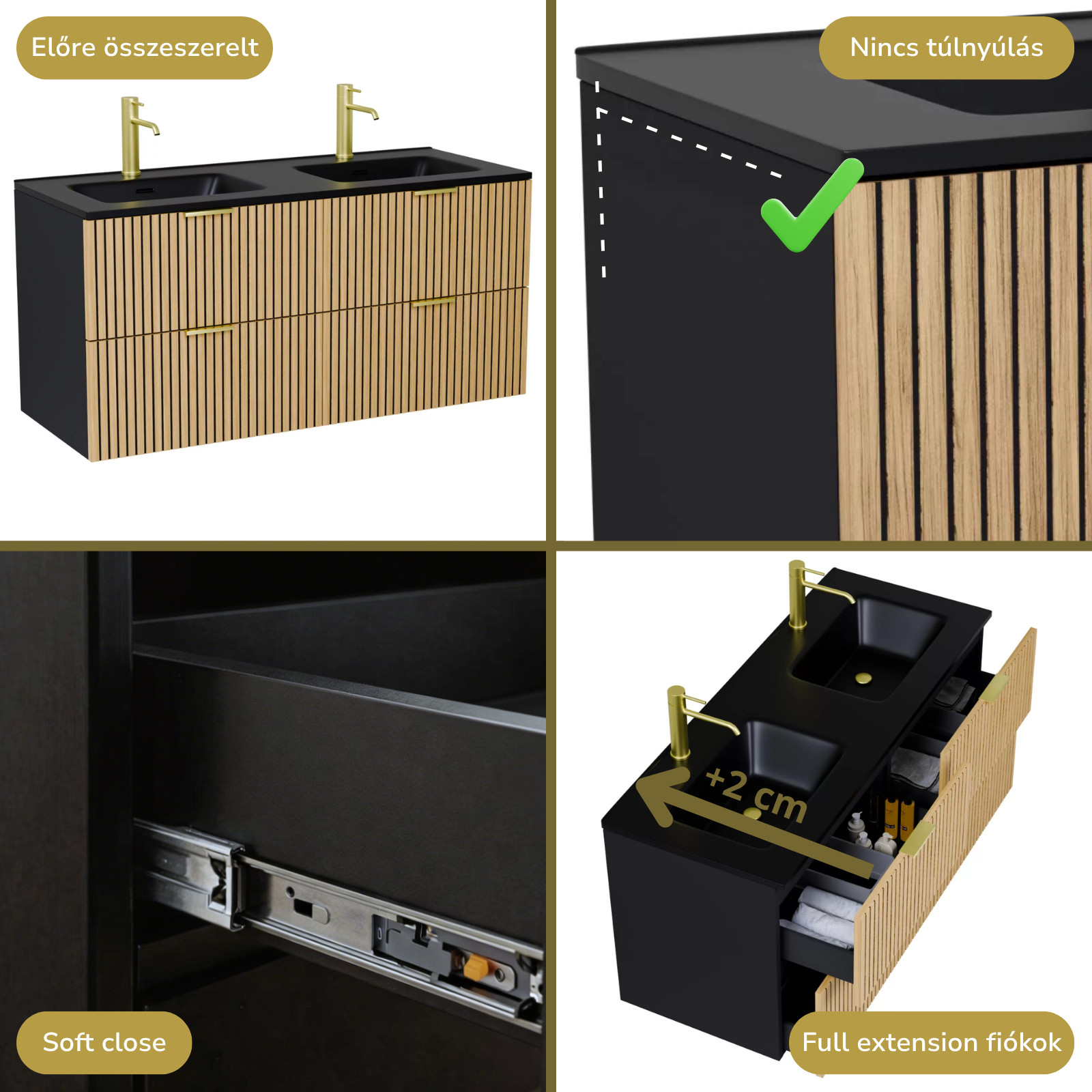 Saját márkás 120 cm széles fali mosdószekrény matt fekete színben, bordázott hikoridió színű fiók fronttal, szálcsiszolt arany fogantyúkkal, fekete slim mosdóval, rejtett fióksínnel és önbehúzos technológiával ellátott.