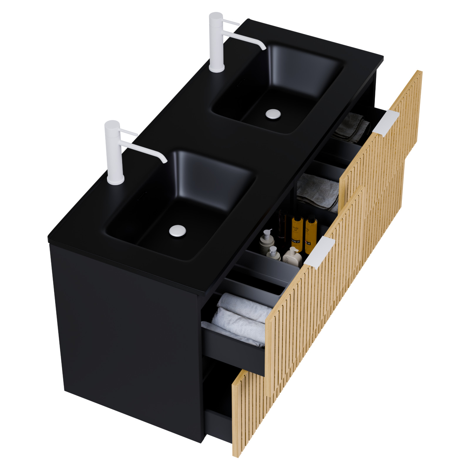 • matt fekete mosdószekrény, teljes kihúzhatóságú fiókokkal