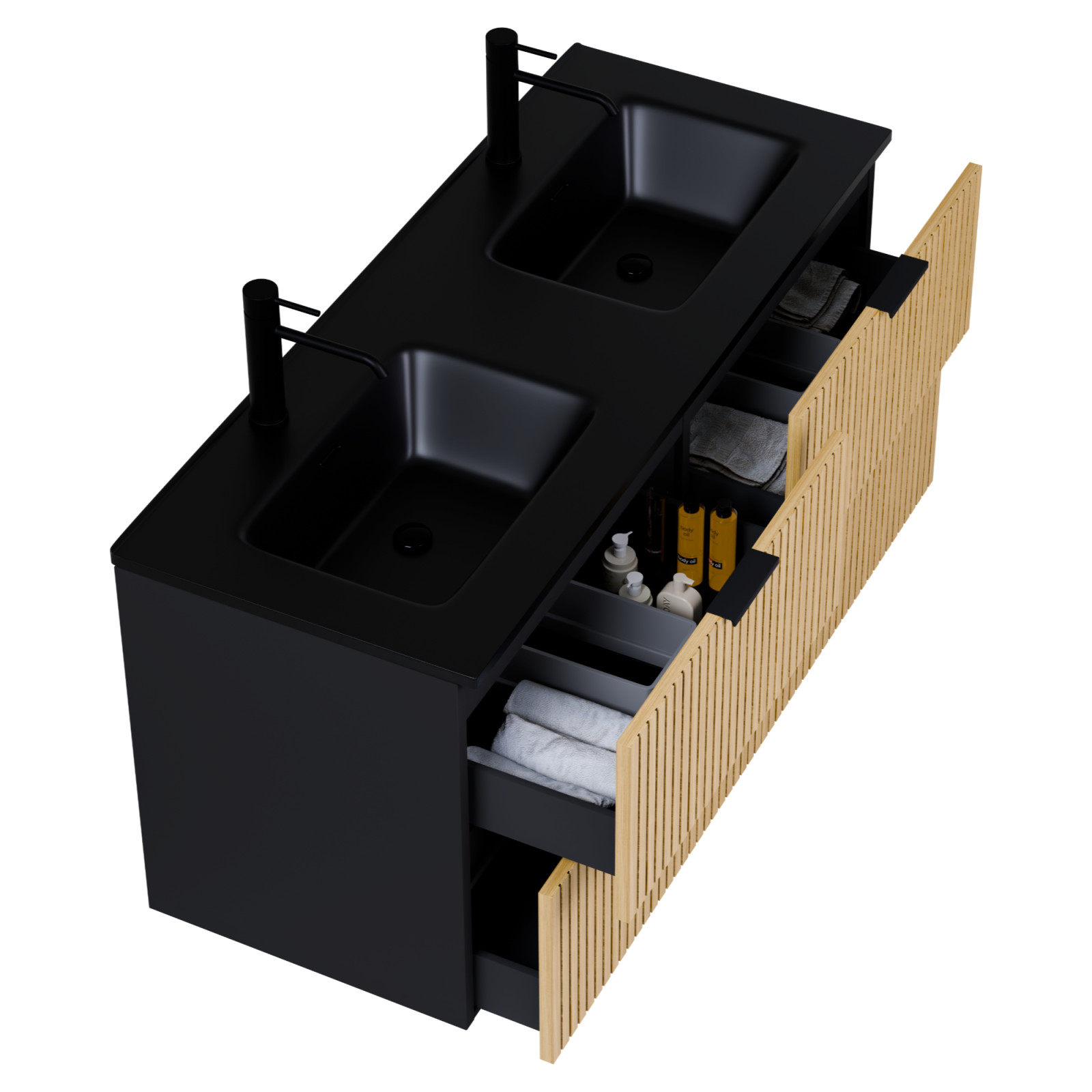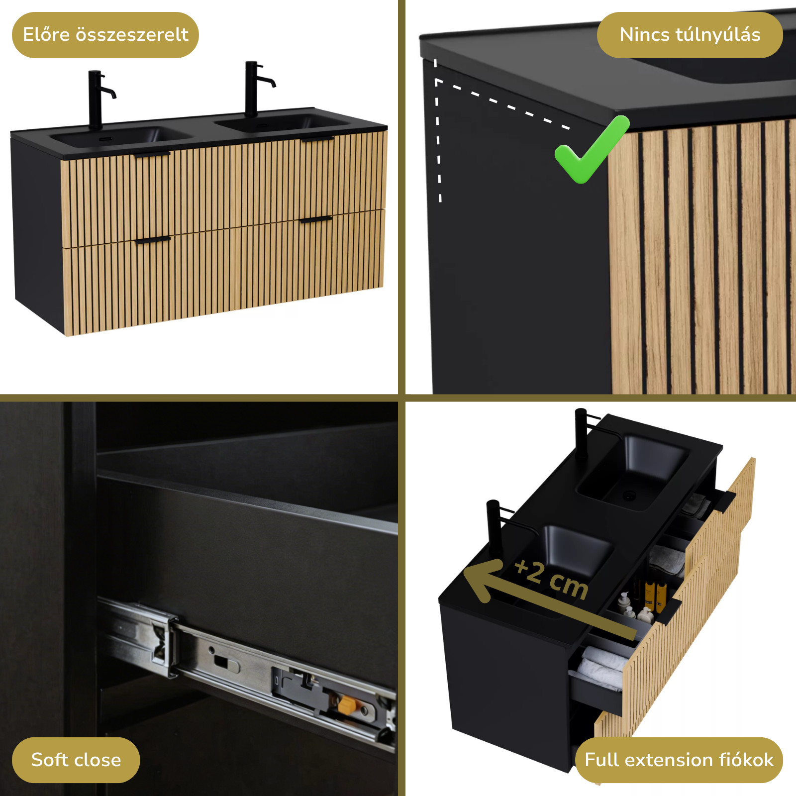Saját márkás 120 cm széles fali mosdószekrény matt fekete színben, bordázott hikoridió színű fiók fronttal, matt fekete fogantyúkkal, fekete slim mosdóval, rejtett fióksínnel és önbehúzos technológiával ellátott.