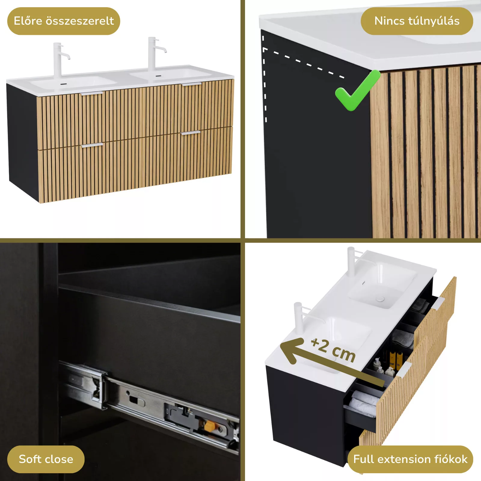 • matt fekete mosdószekrény, teljes kihúzhatóságú fiókokkal