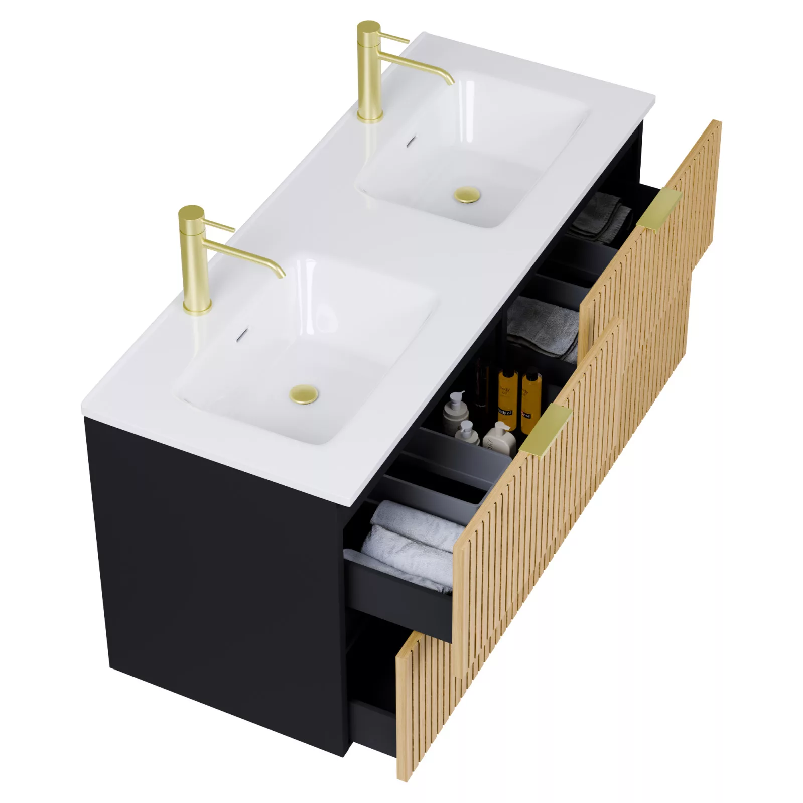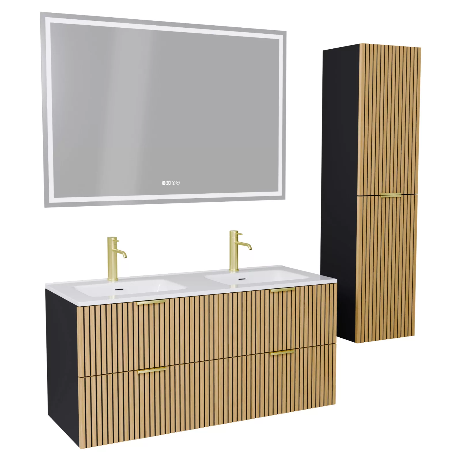 Saját márkás 120 cm széles komplett fürdőszoba bútor fali mosdószekrénnyel matt fekete színben, bordázott hikoridió színű fiók fronttal, szálcsiszolt arany fogantyúkkal, okos LED tükörrel és magasszekrénnyel.