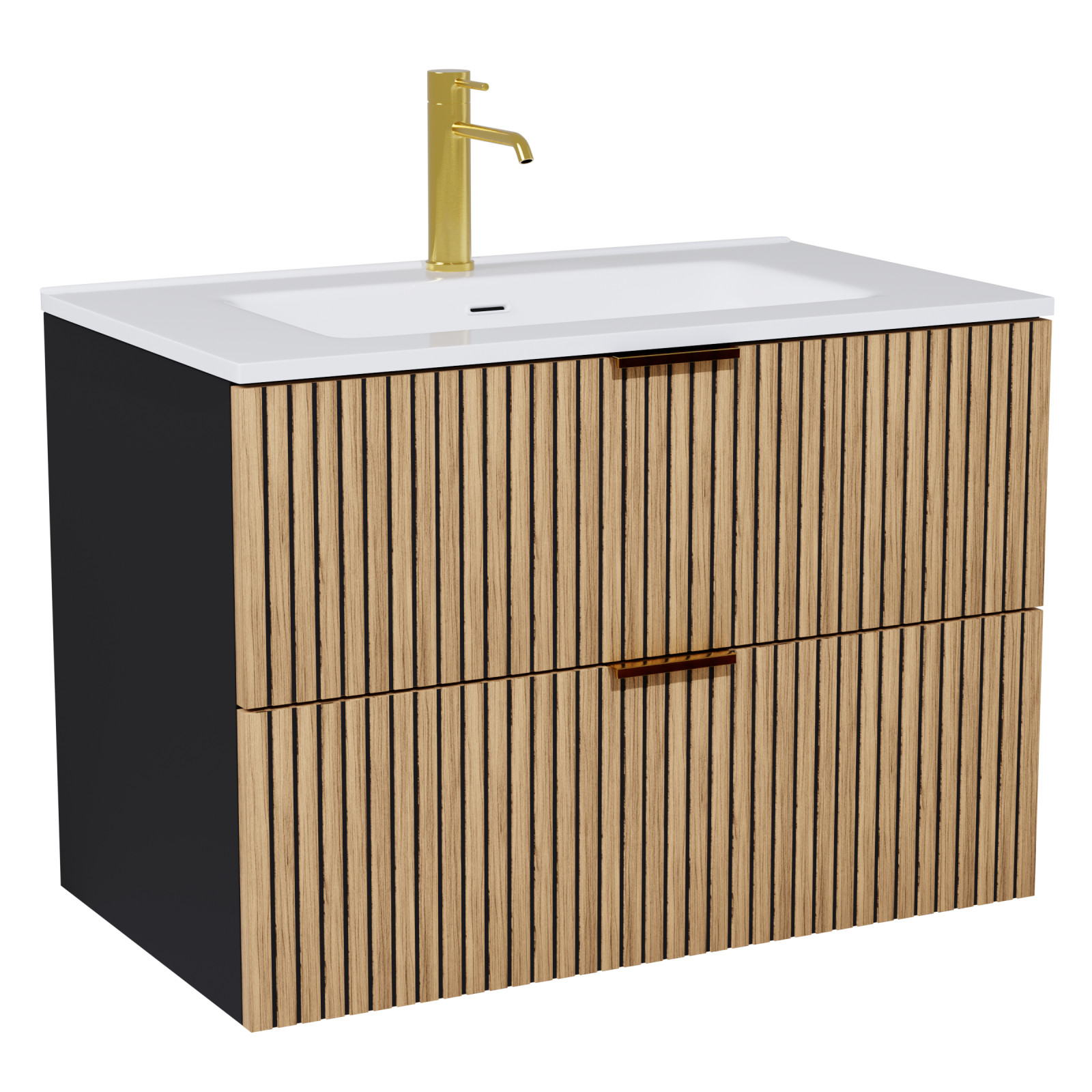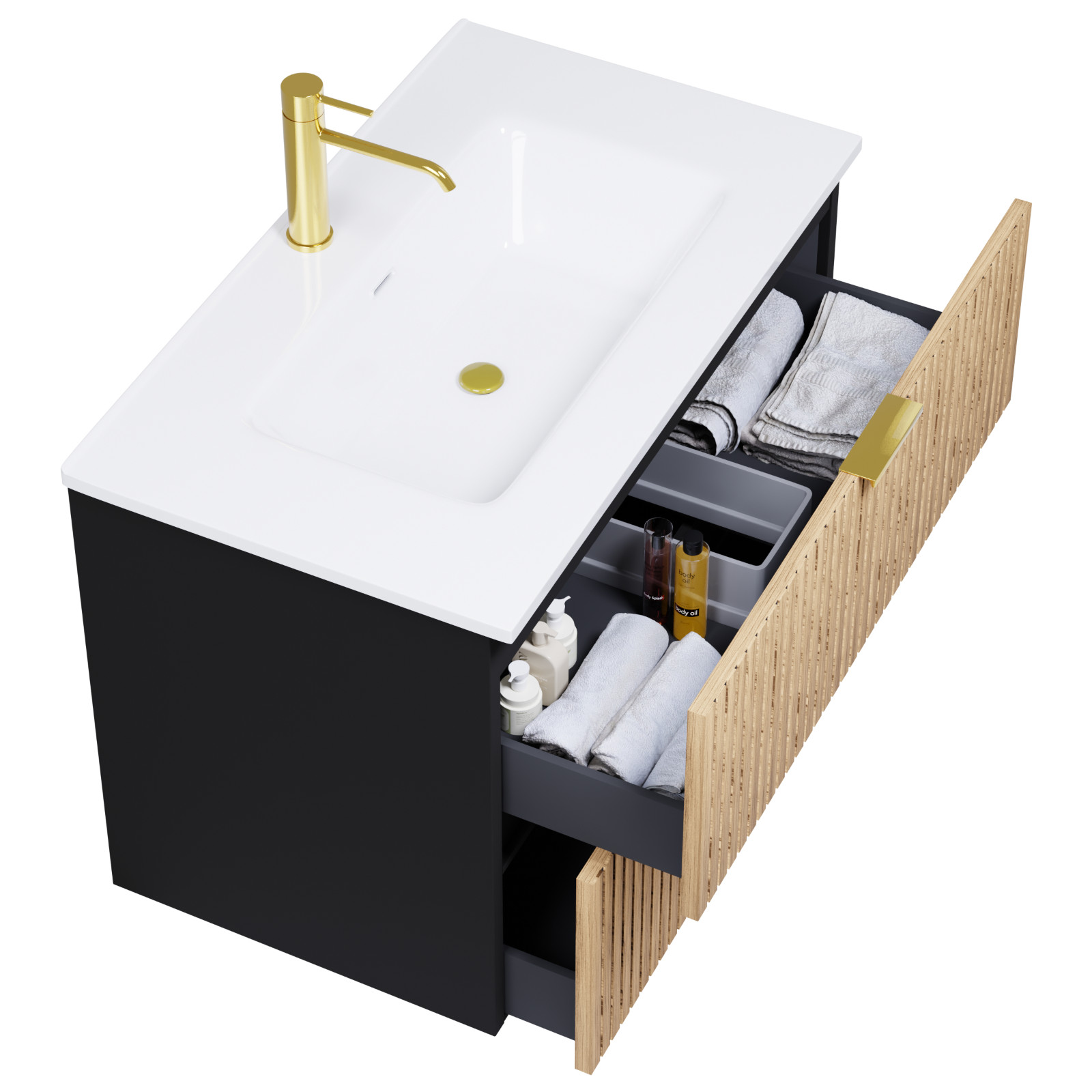 Saját márkás 60 cm széles fali mosdószekrény matt fekete színben, bordázott hikoridió színű fiók fronttal, szálcsiszolt arany fogantyúkkal, fényes fehér slim mosdóval, rejtett fióksínnel és önbehúzos technológiával ellátott.