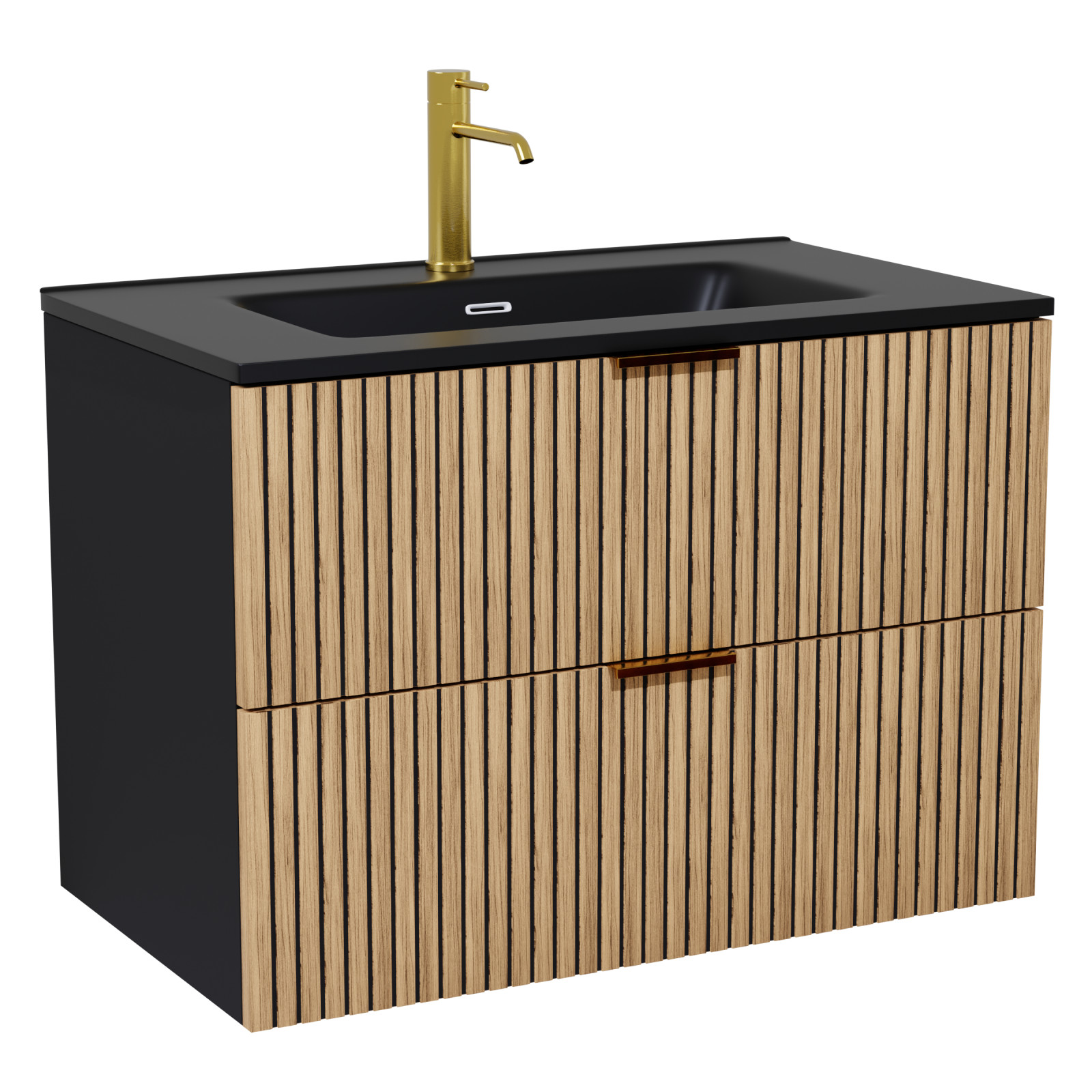 Saját márkás 60 cm széles fali mosdószekrény matt fekete színben, bordázott hikoridió színű fiók fronttal, szálcsiszolt arany fogantyúkkal, fekete slim mosdóval, rejtett fióksínnel és önbehúzos technológiával ellátott.