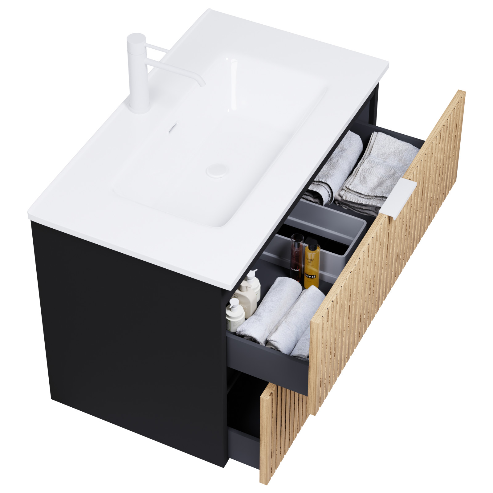 Saját márkás 60 cm széles fali mosdószekrény matt fekete színben, bordázott hikoridió színű fiók fronttal, matt fehér fogantyúkkal, fényes fehér slim mosdóval, rejtett fióksínnel és önbehúzos technológiával ellátott.