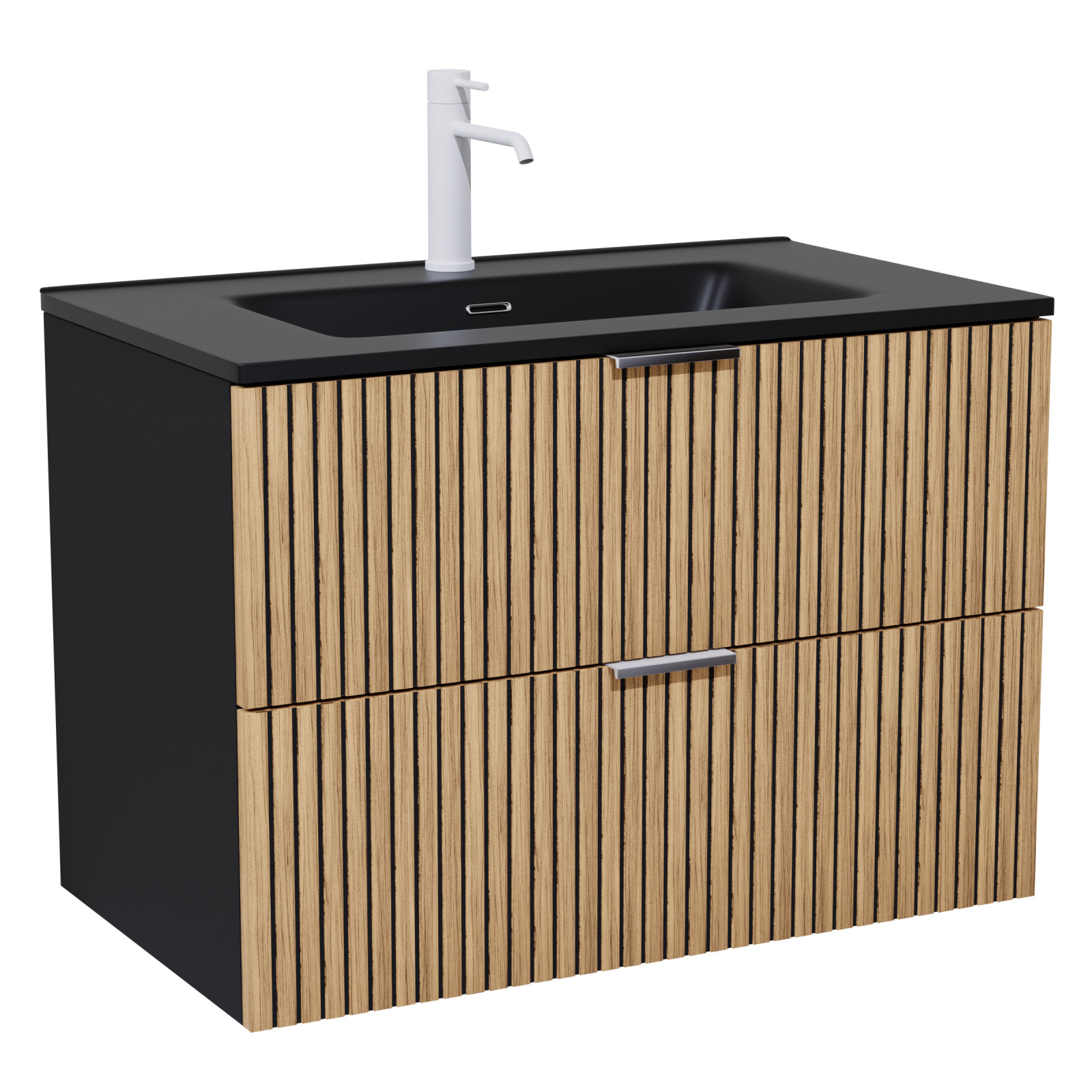 Saját márkás 60 cm széles komplett fürdőszoba bútor fali mosdószekrénnyel matt fekete színben, bordázott hikoridió színű fiók fronttal, matt fehér fogantyúkkal, fekete slim mosdóval és fali okos LED tükörrel.