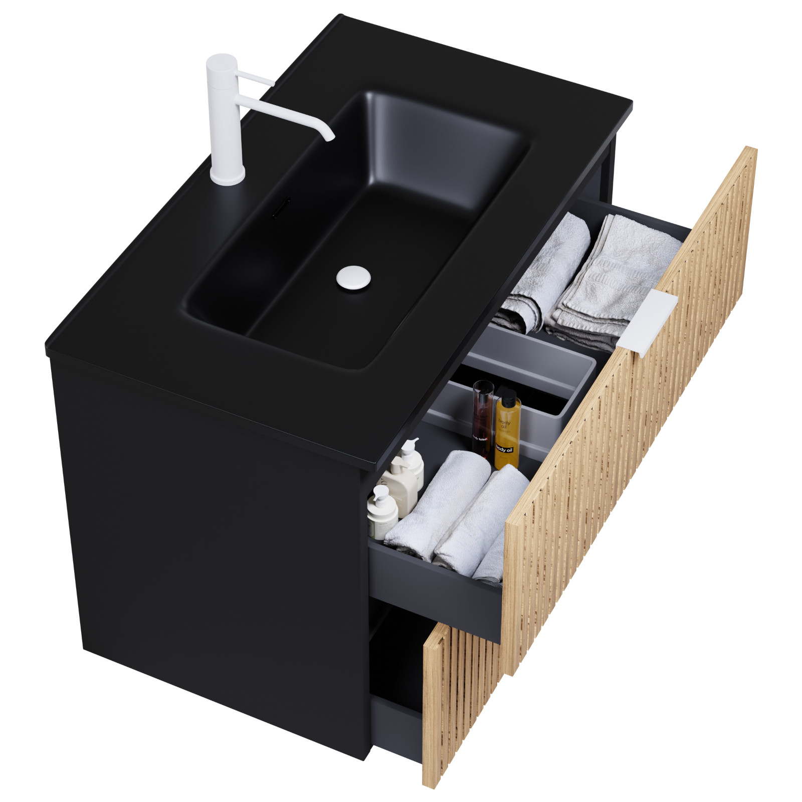 • matt fekete mosdószekrény, teljes kihúzhatóságú fiókokkal