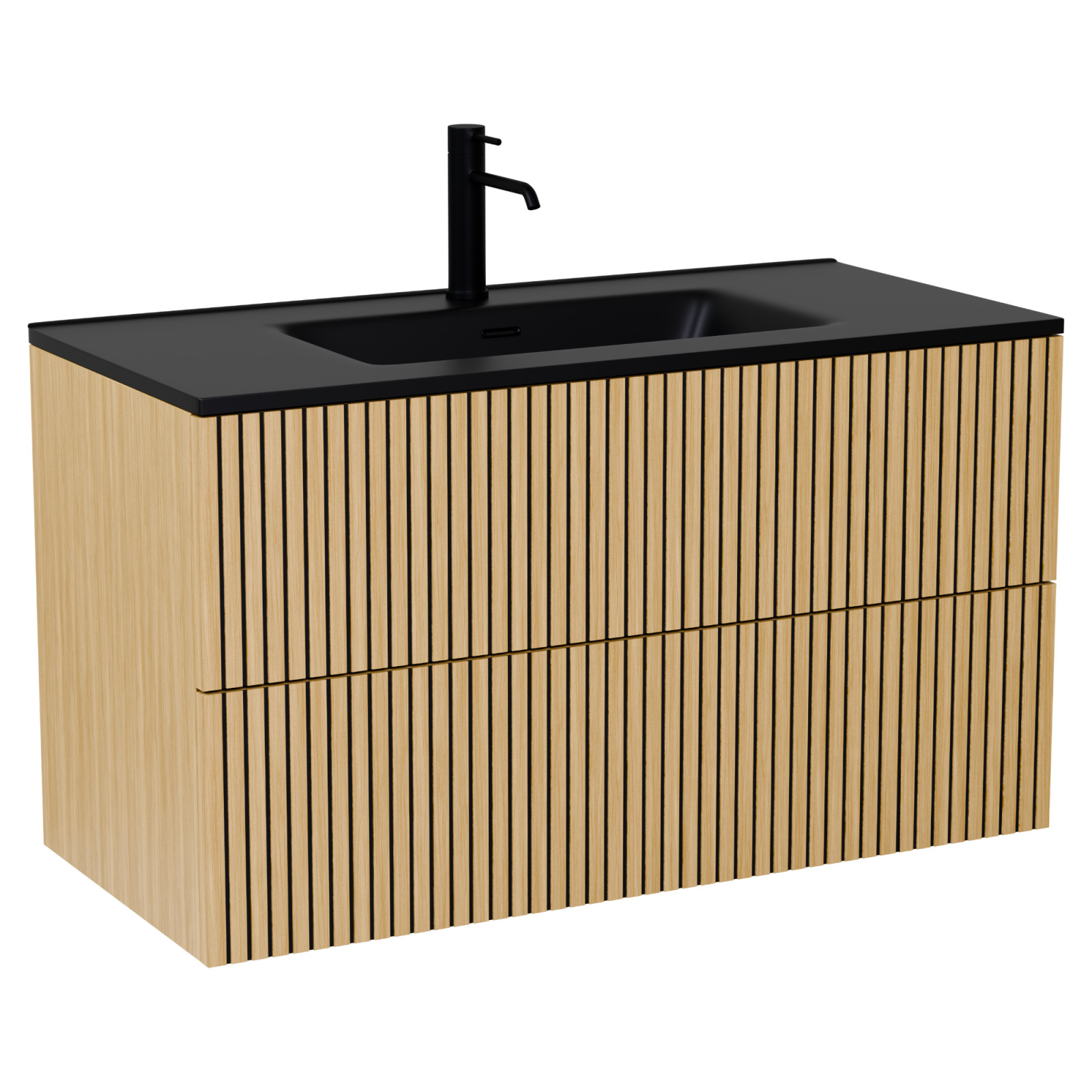 HD Parma Pro Hickory 100 fali mosdószekrény, push-to-open mechanizmussal és matt fekete slim mosdóval