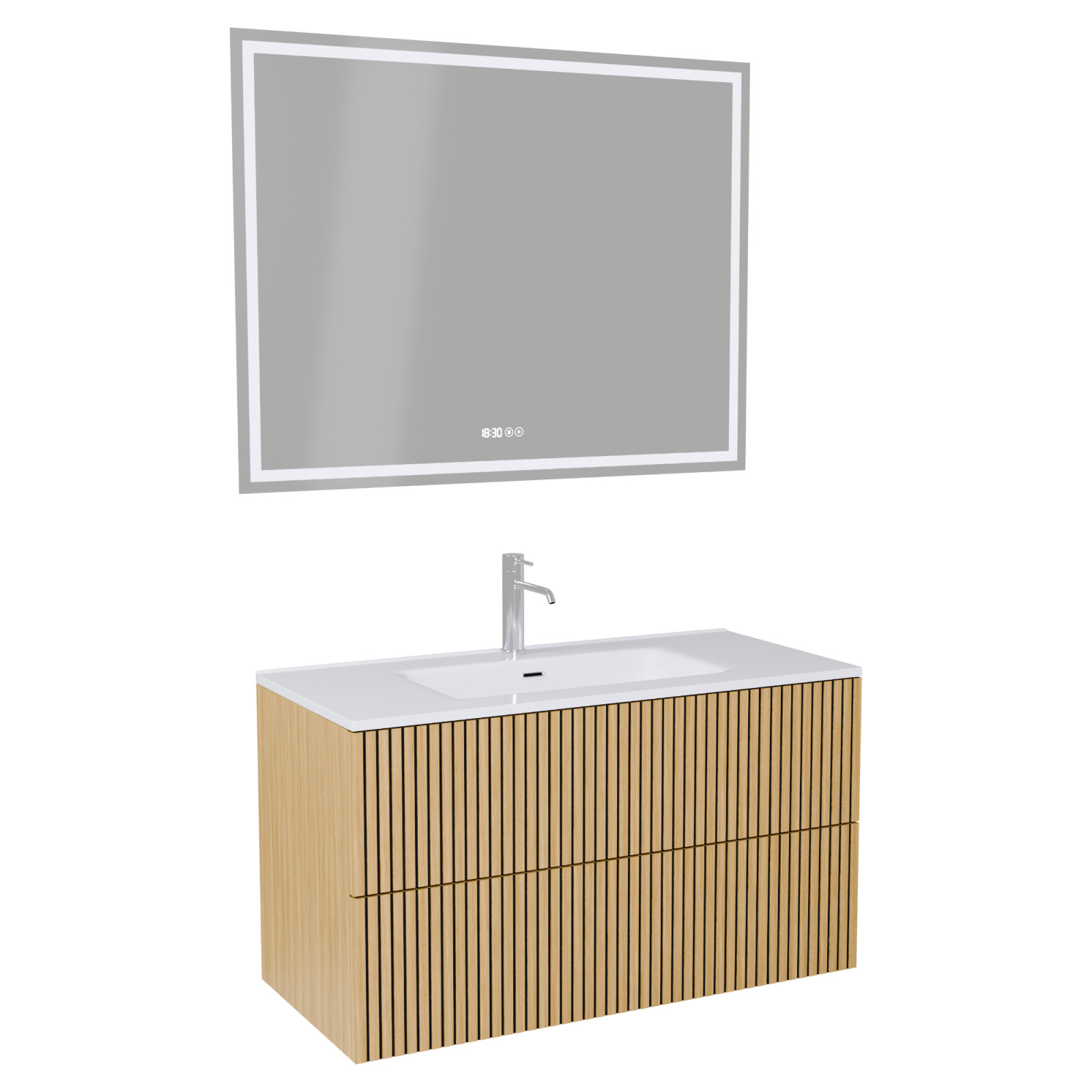Saját márkás 100 cm széles komplett fürdőszoba bútor fali mosdószekrénnyel hikoridió színben, bordázott hikoridió színű fiók fronttal, fényes fehér slim mosdóval és fali okos LED tükörrel. A fiókok modern push-to-open mechanizmussal nyílnak, amely mechanikus rugós rendszerrel biztosítja a fogantyú nélküli nyitást.
