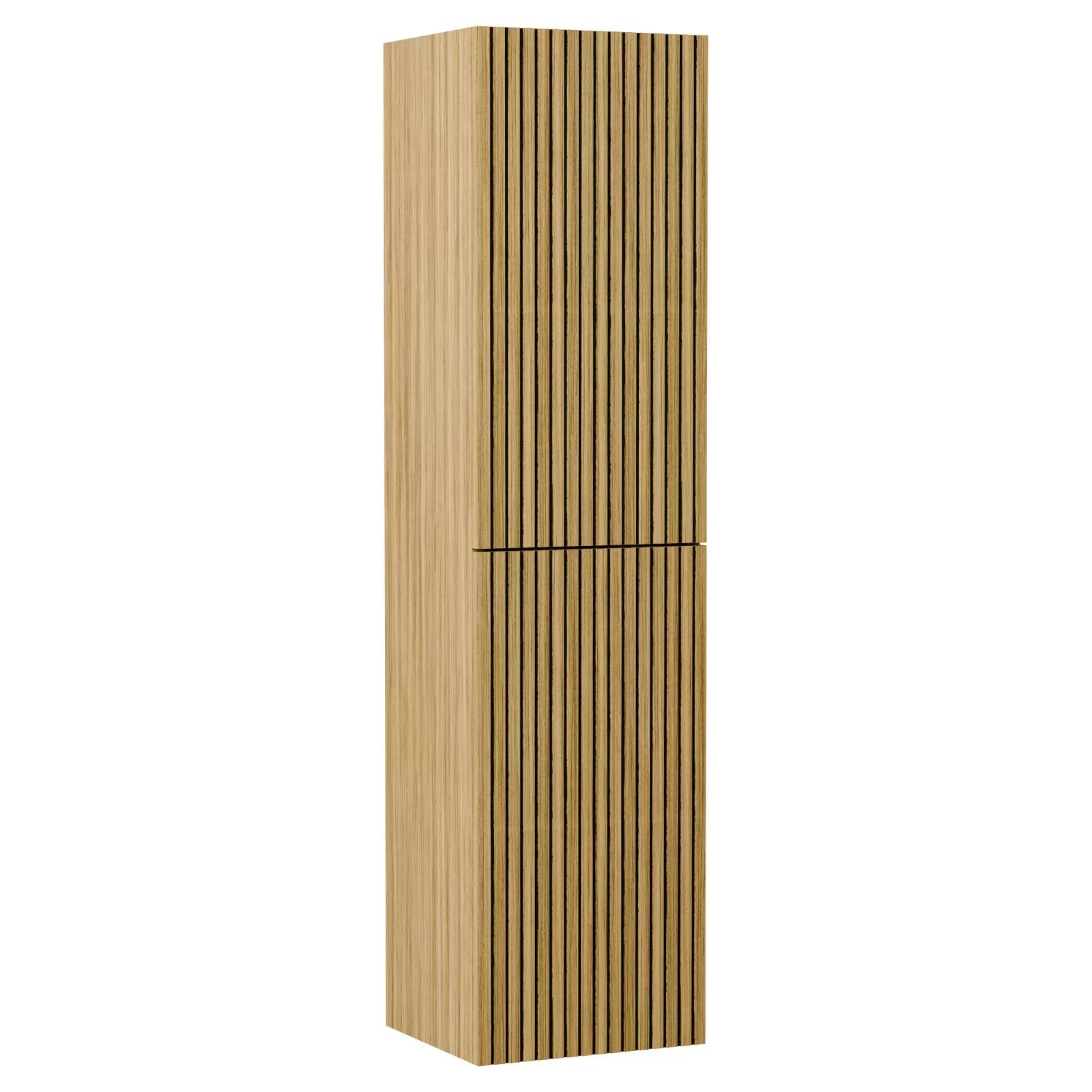 Saját márkás 120 cm széles komplett fürdőszoba bútor fali mosdószekrénnyel hikoridió színben, bordázott hikoridió színű fiók fronttal, okos LED tükörrel és magasszekrénnyel. A fiókok modern push-to-open mechanizmussal nyílnak, amely mechanikus rugós rendszerrel biztosítja a fogantyú nélküli nyitást.